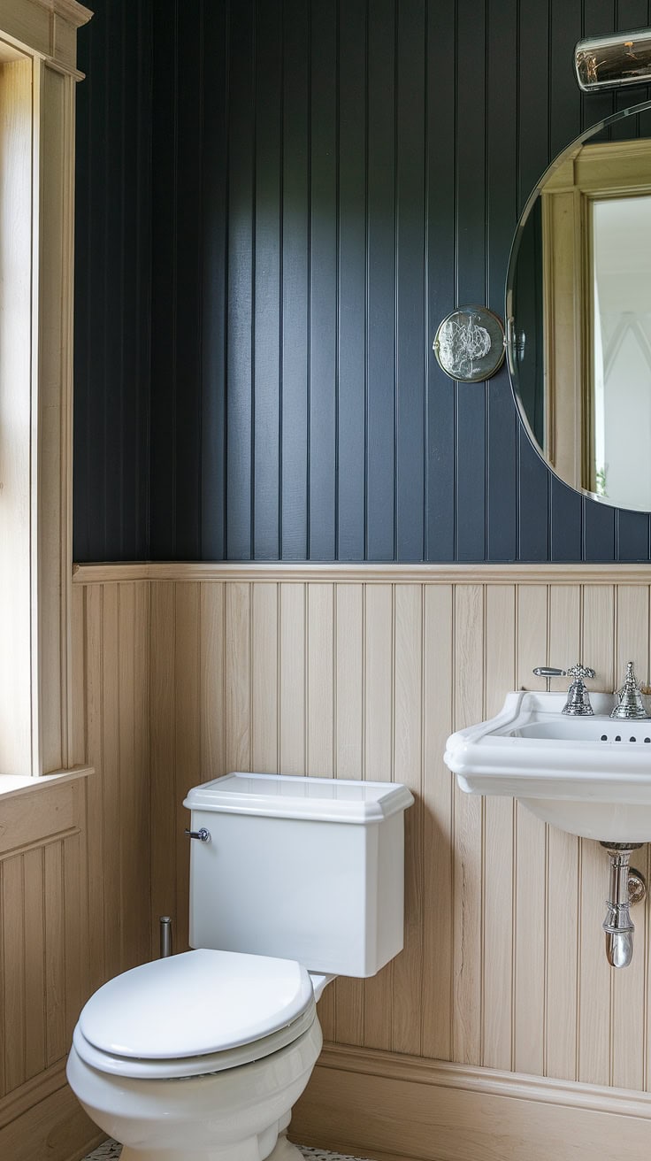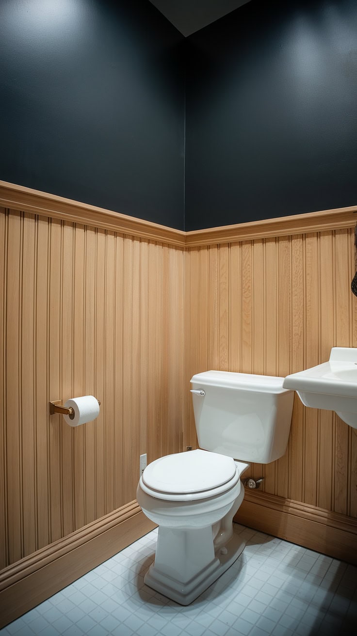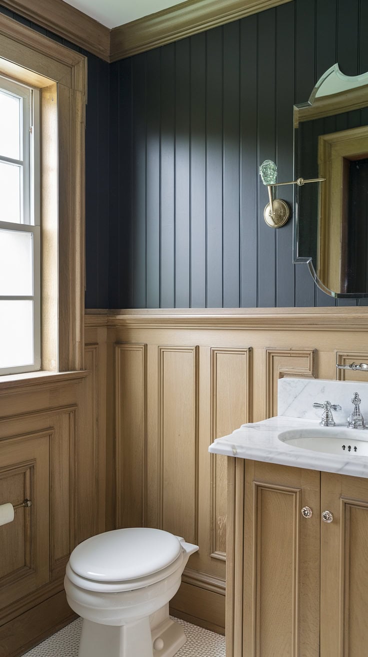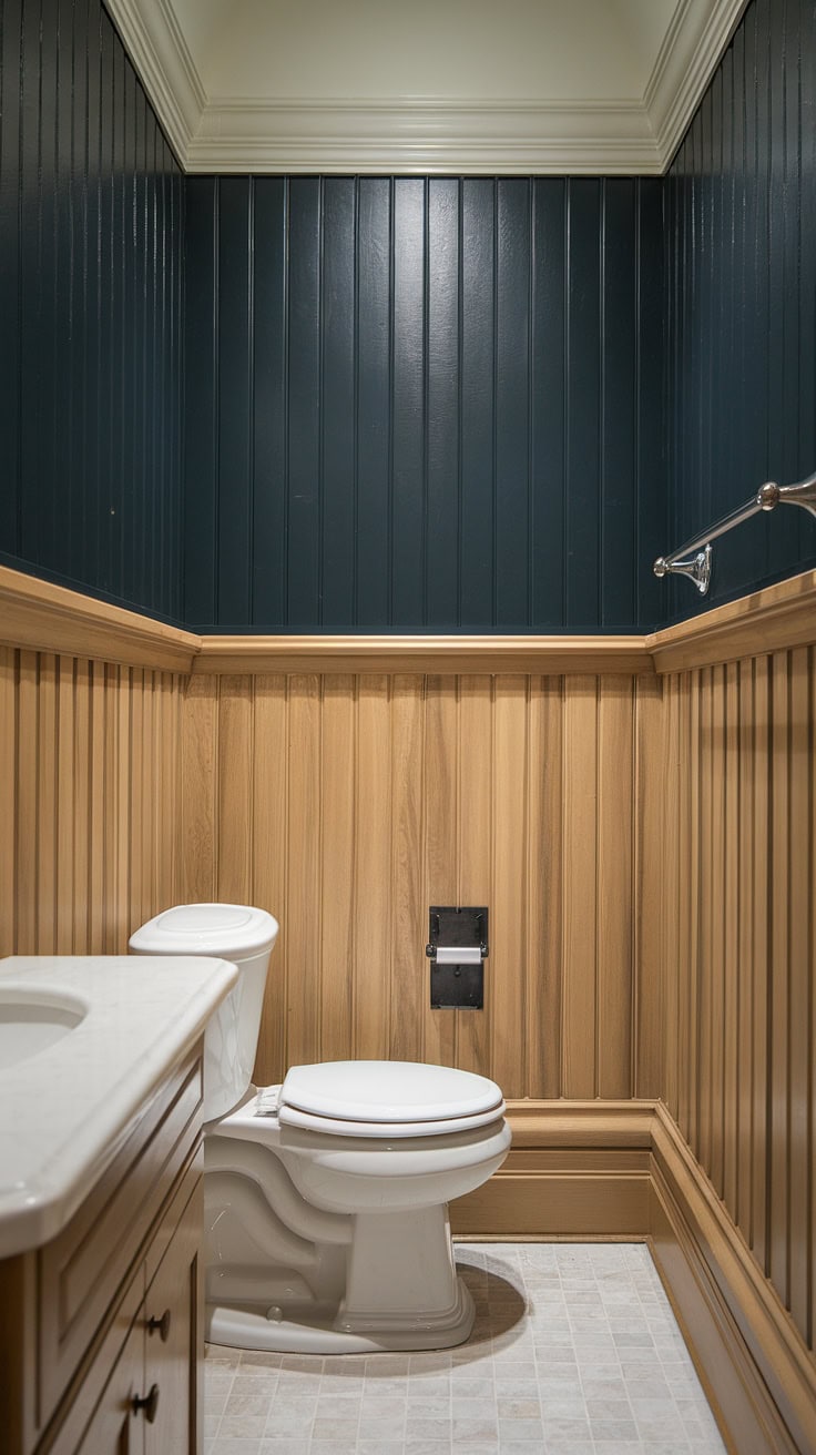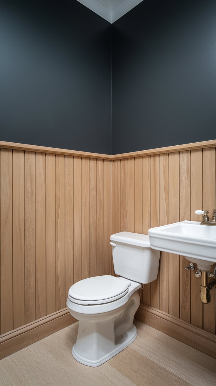 Embracing the warmth of natural wood and the drama of dark beadboard, this elegant half bath combines light wood wainscoting with rich stained paneling to create a layered, textured environment. The timeless design enhances the guest bathroom wainscoting, making it an inviting and polished retreat.