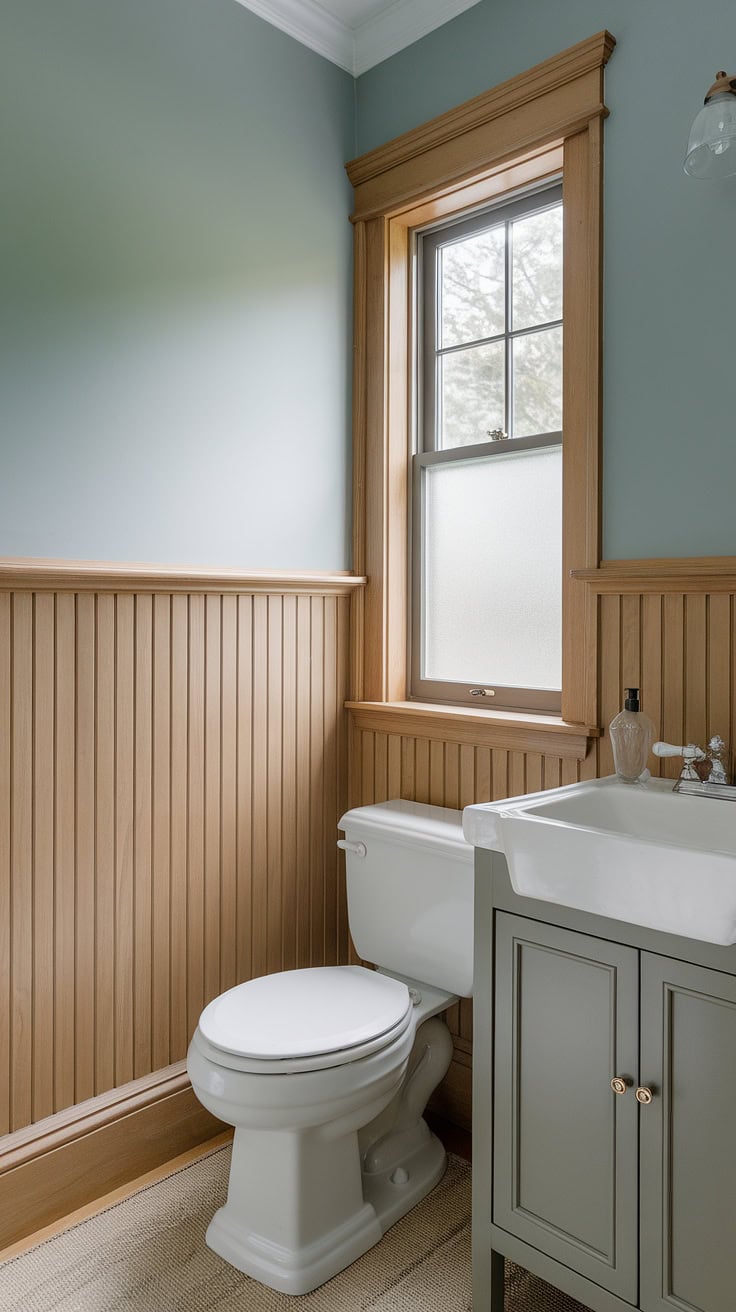 This half bath wainscoting effortlessly merges classic appeal with contemporary utility. The light-toned wood panels combined with soft blue beadboard walls offer a tranquil setting, complemented by warm stained wood accents and a privacy-focused frosted window—resulting in a serene yet stylish guest bathroom ambiance.