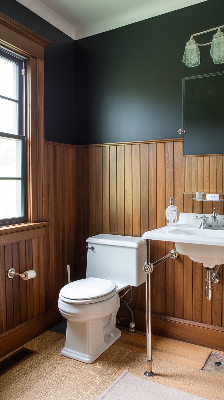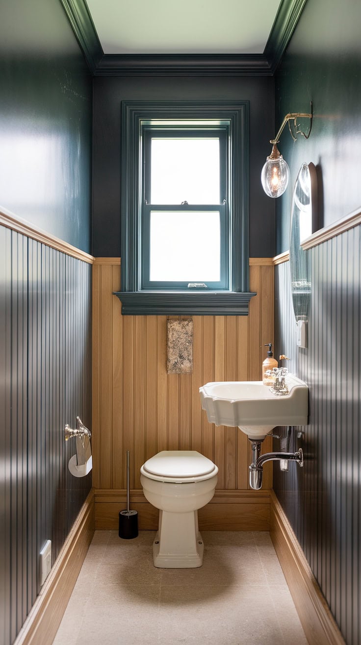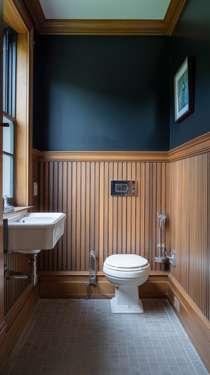 Elevating half bath aesthetics, this design unites bright wooden wainscoting with striking dark beadboard walls, producing an elegant contrast. Stained wood wall panels warm the room while natural light flowing through a window adds uplifting brightness to this sophisticated powder room.