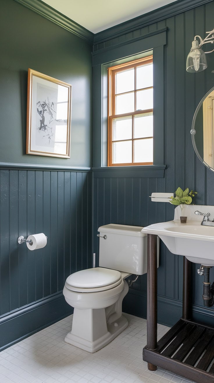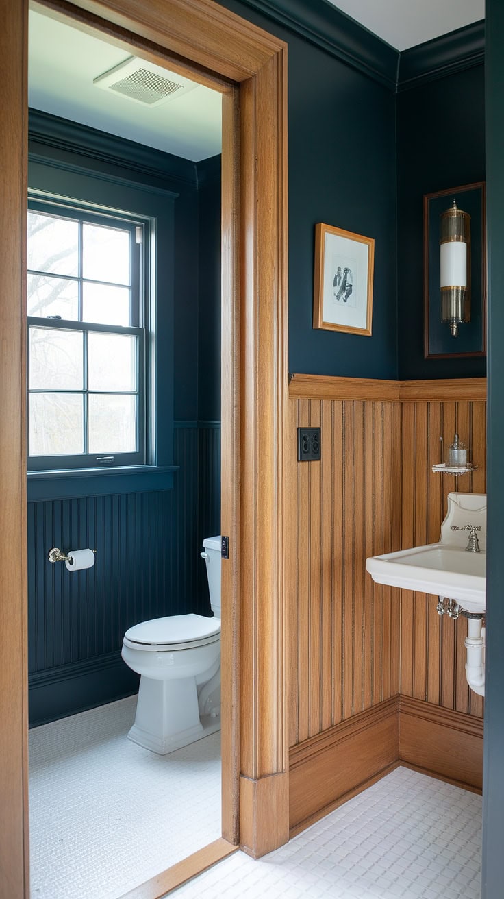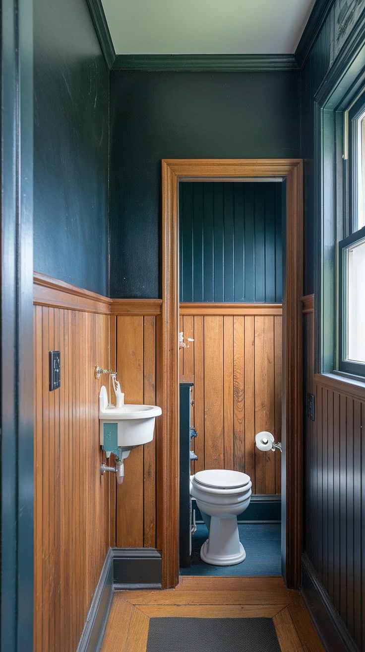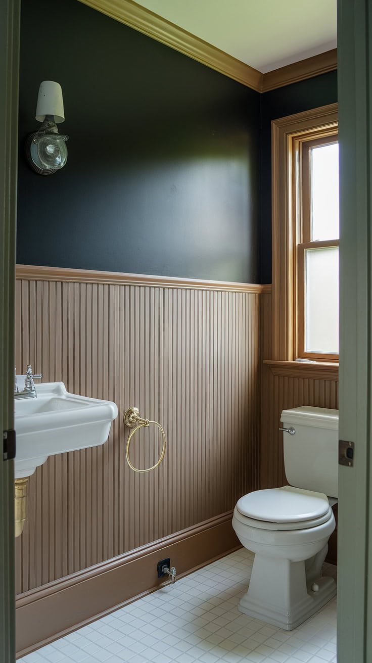 Elevating half bath aesthetics, this design unites bright wooden wainscoting with striking dark beadboard walls, producing an elegant contrast. Stained wood wall panels warm the room while natural light flowing through a window adds uplifting brightness to this sophisticated powder room.