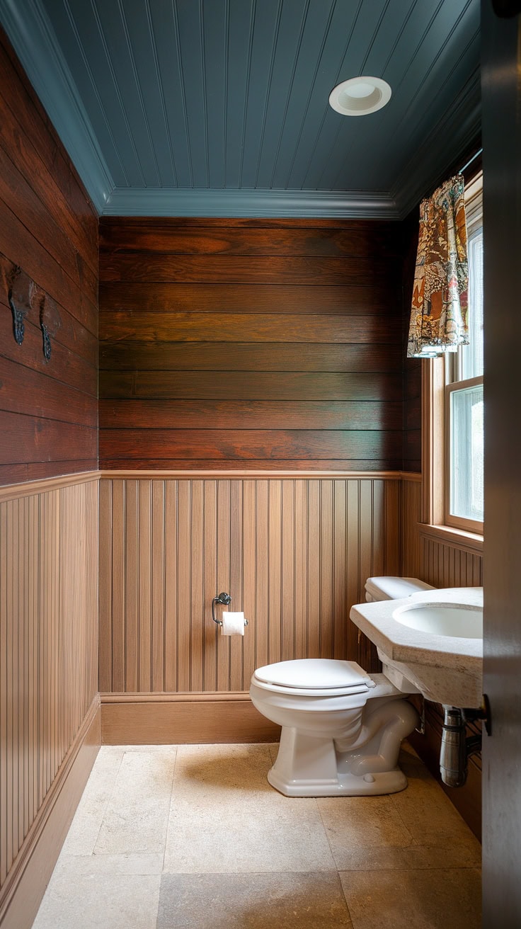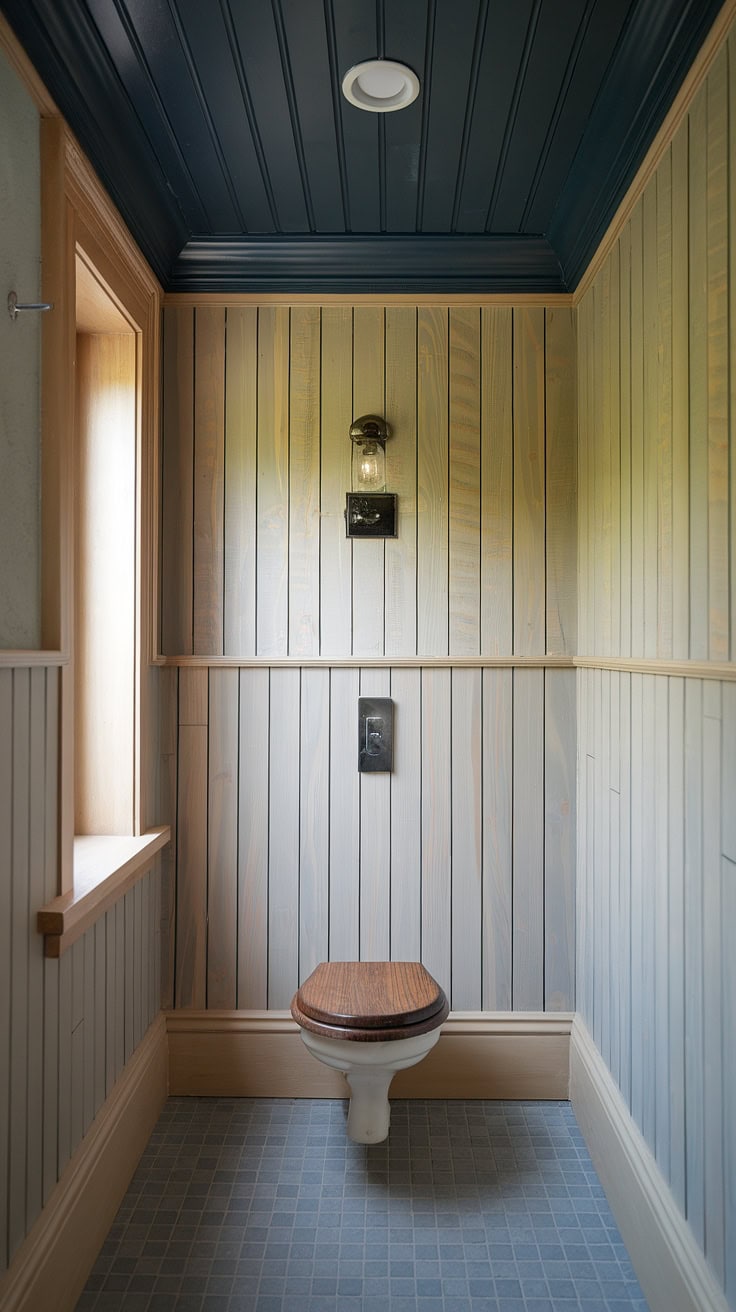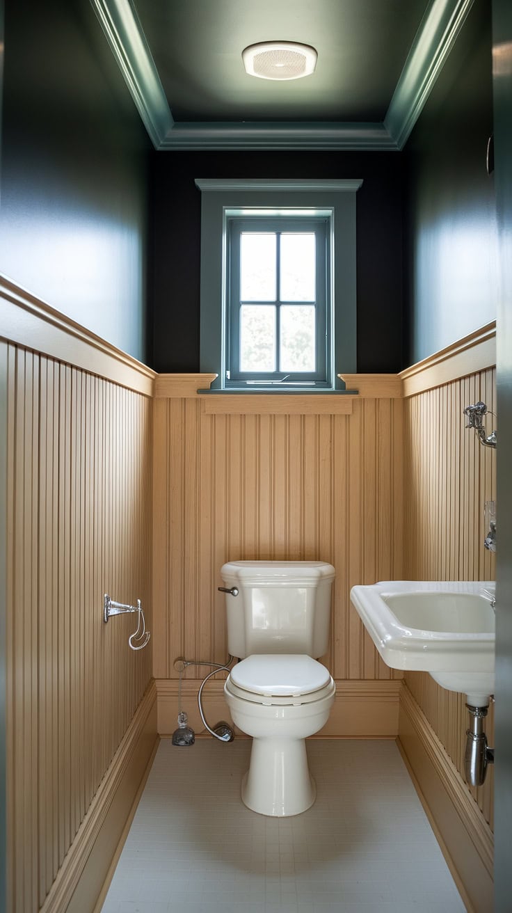This powder room boasts a refined aesthetic with the cool contrast of light wood wainscoting beneath dark-painted beadboard ceilings. The stained wooden wall panels serve as the visual centerpiece, while natural light streams through a window, brightening this compact, artfully designed wood-paneled powder room.