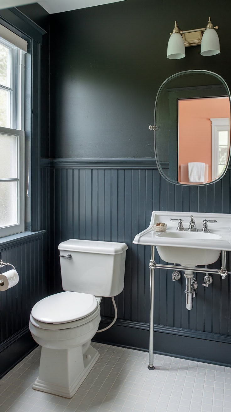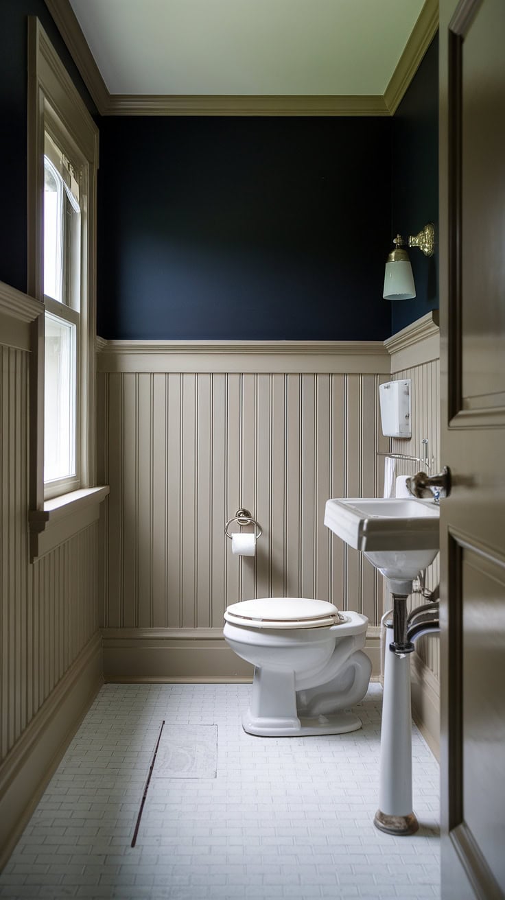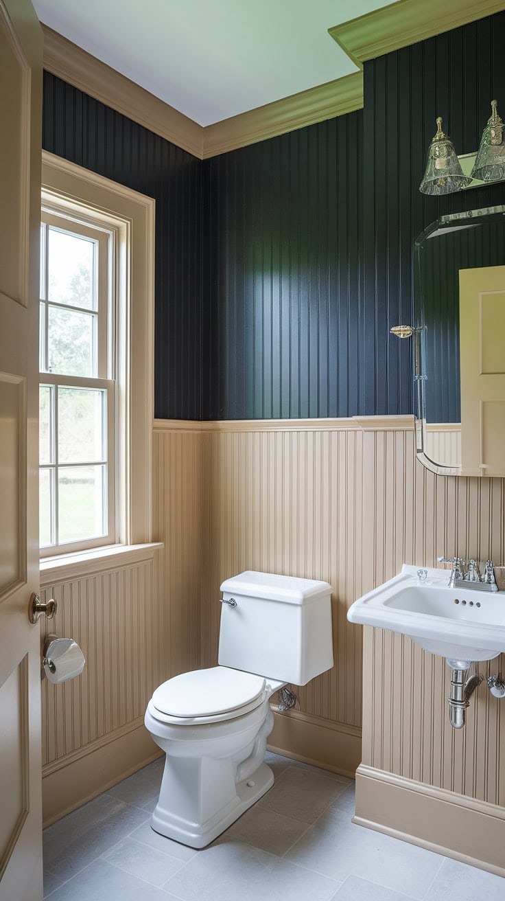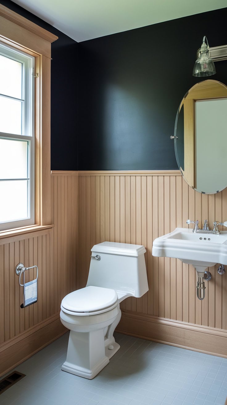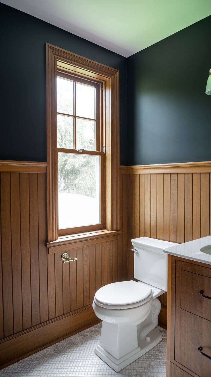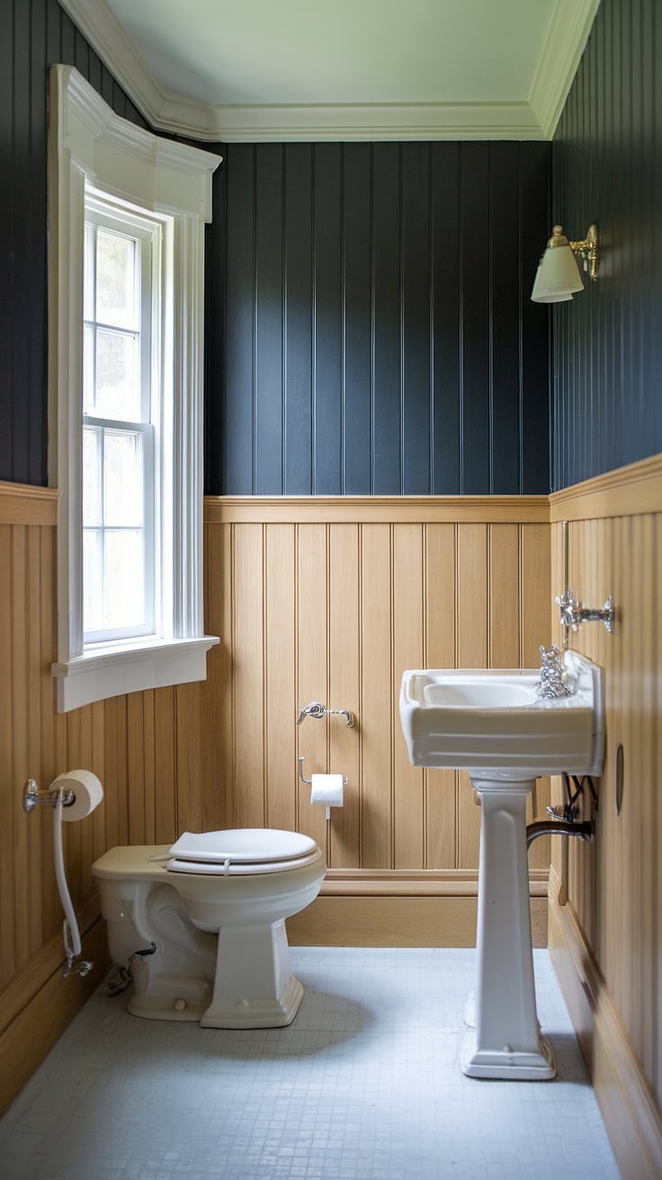 This gently inviting half bath features light wood wainscoting paired with deep-hued stained wood walls, contrasted by dark painted beadboard above. Together with tile flooring and natural lighting through a window, this powder room balances coziness with fresh sophistication—an alluring choice for a guest bathroom design.