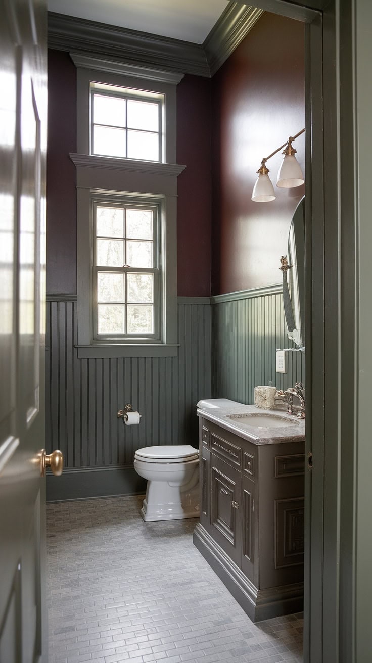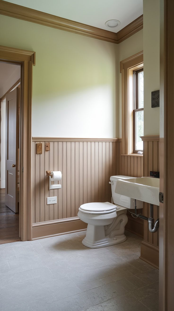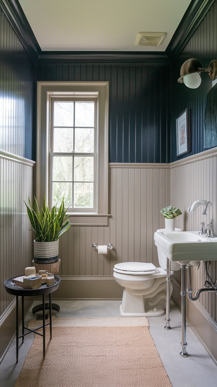 This guest bathroom showcases a refined wainscoting solution that transitions seamlessly from light wooden panels at the base to deep-colored beadboard walls above. The interplay of textures and finishes—highlighted by the carefully stained wood paneling—creates a welcoming and practical half bath. The understated elegance is further enhanced by minimalist fixtures, lending understated sophistication to the space.