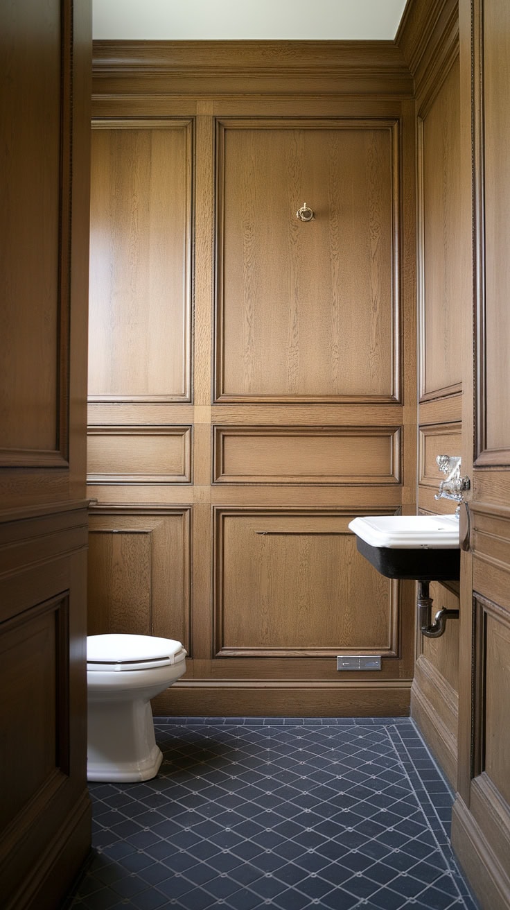 This refined half bath is elevated by tasteful wainscoting that harmonizes light wooden panels with rich paneled walls and a dark, tile flooring scheme. Each element works in concert to create a welcoming guest bathroom wainscoting area that exudes comfort and style.