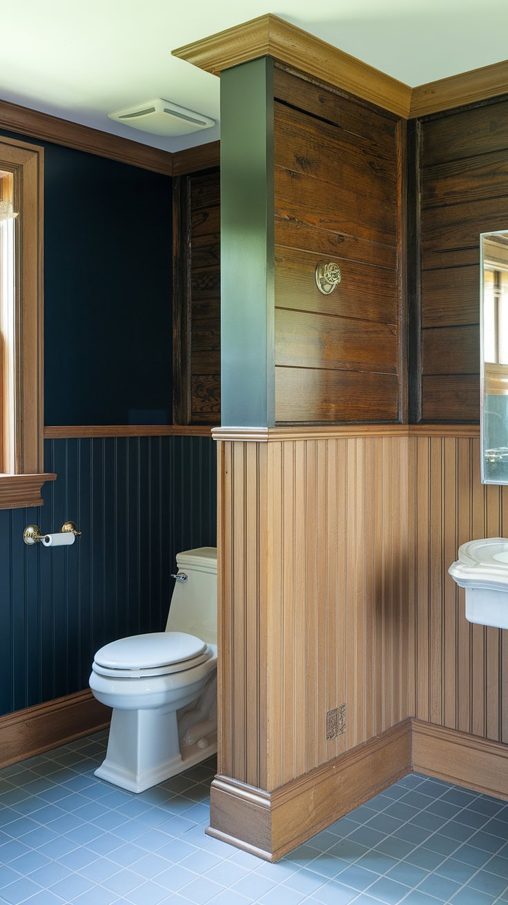 This half bath is a dazzling display of texture and tone, blending light wood wainscoting with dark, painted beadboard walls. Together with rich stained wall panels, these elements form a visually intriguing yet welcoming environment in this bathroom with wood panel wall—an exemplar of contemporary rustic elegance.