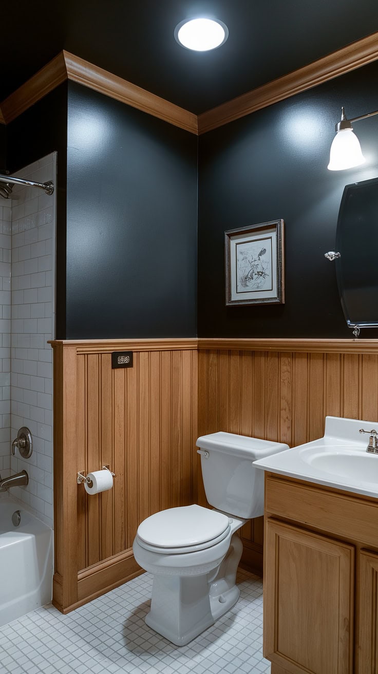 Classic influences meet modern-day appeal in this half bath, where bright wooden wainscoting contrasts strikingly with dark beadboard walls. The overall effect adds welcoming warmth and texture, making this a cozy guest bathroom wainscoting design to inspire your next renovation.