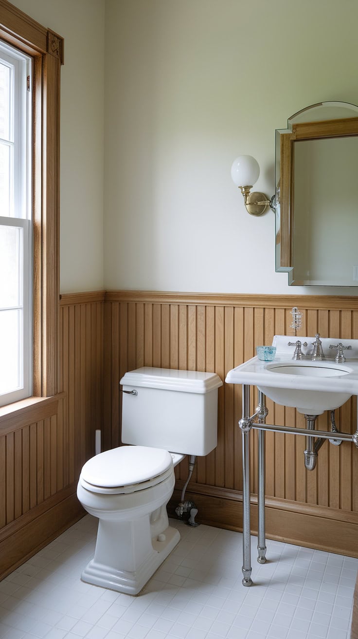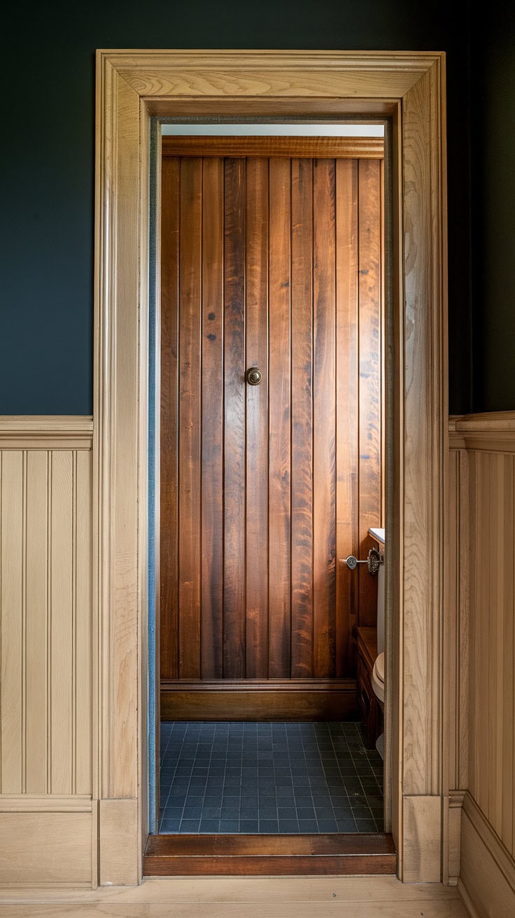 Featuring a delicate balance of light wainscoting and deep beadboard finishes, this half bath exhibits an elegant interplay of texture and tone. Stained wood paneling adds warmth and depth, firmly establishing this space as a refined, practical wood-paneled powder room.