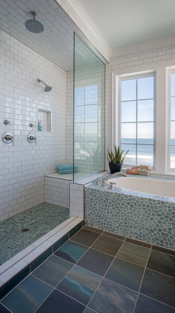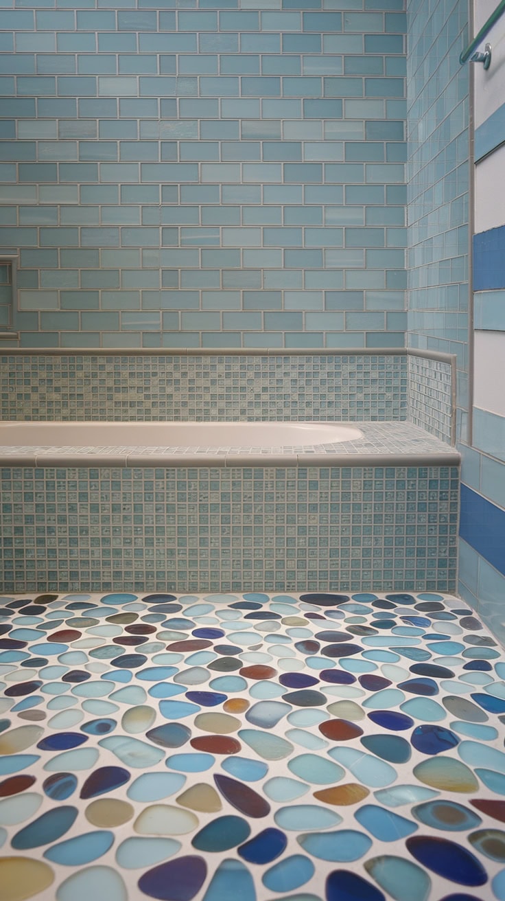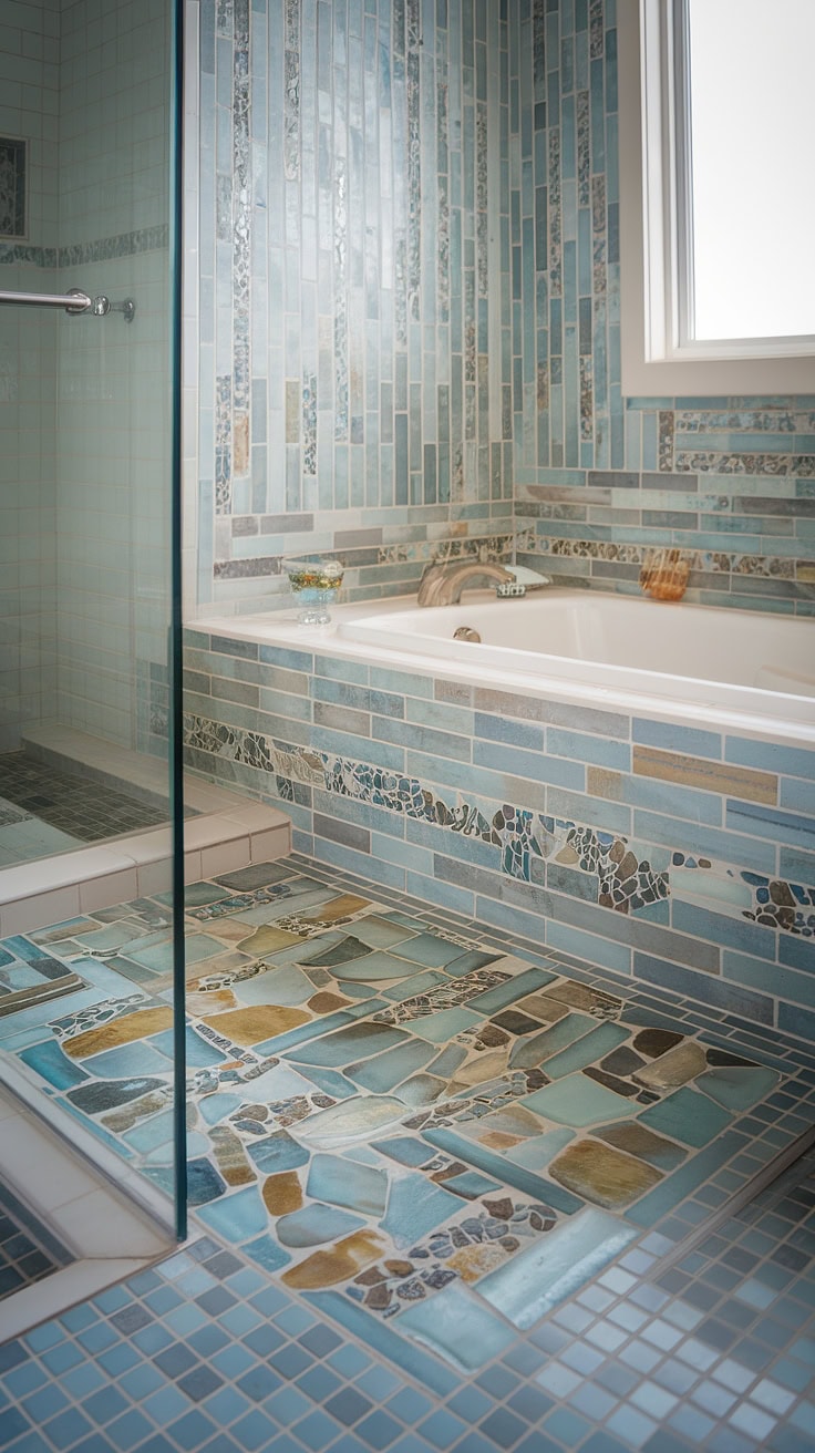 Transform your daily routine into a beachside getaway with this enchanting coastal bathroom. The shower floor dazzles with an engaging sea glass tile pattern, a perfect example of colorful shower tile at its finest. Meanwhile, the mosaic tub surround conjures the fluidity of ocean currents, while the large-format tub wall tiles balance intricate shower tile details to complete this soothing seaside look. Highlighting the freshest trends in tile design, this concept offers innovative inspiration for mosaic bathroom transformations, celebrating beach bathroom tile designs.