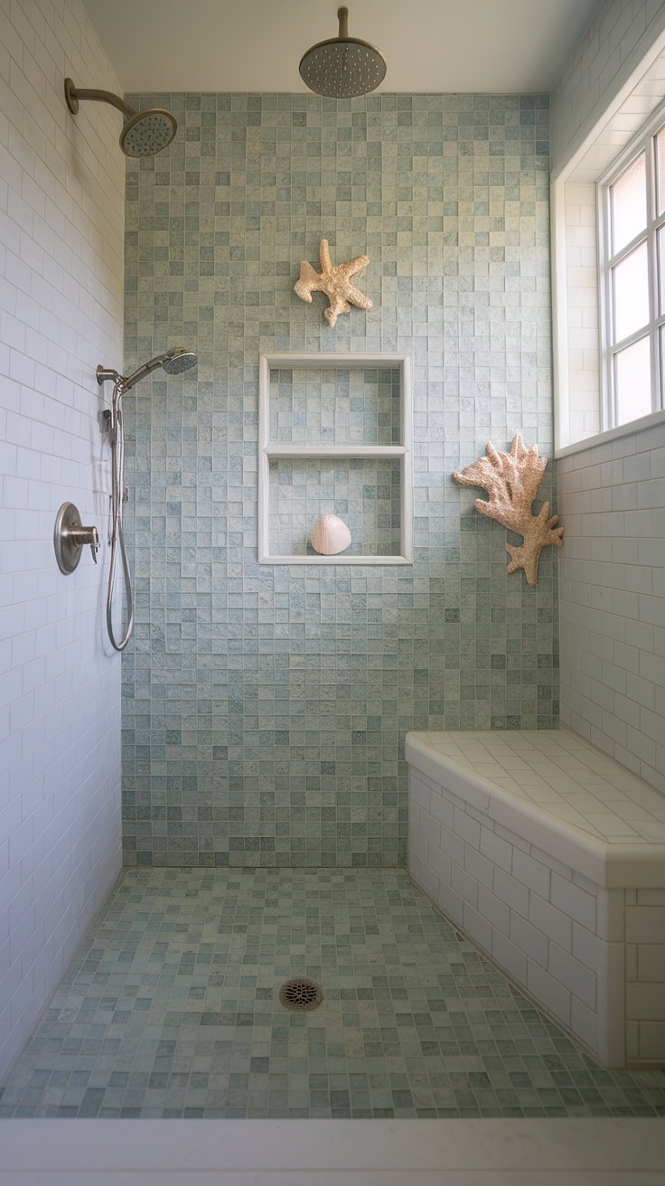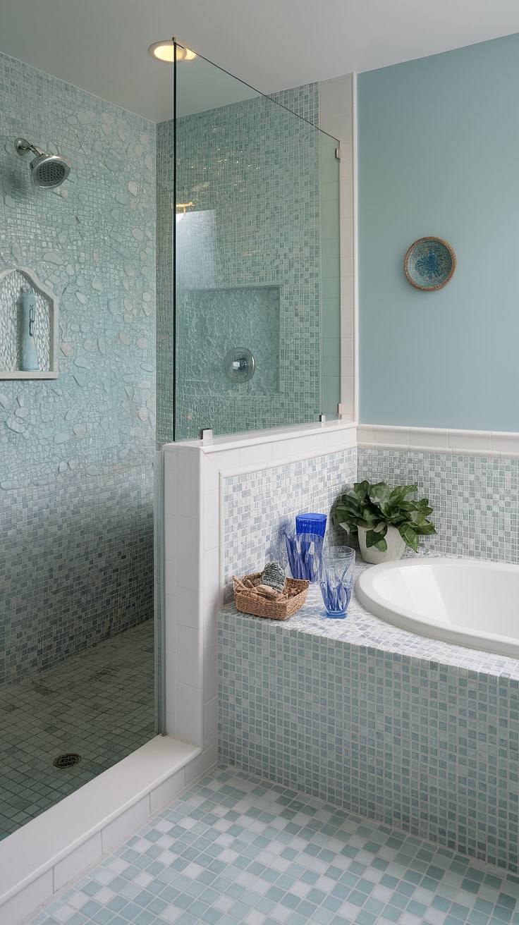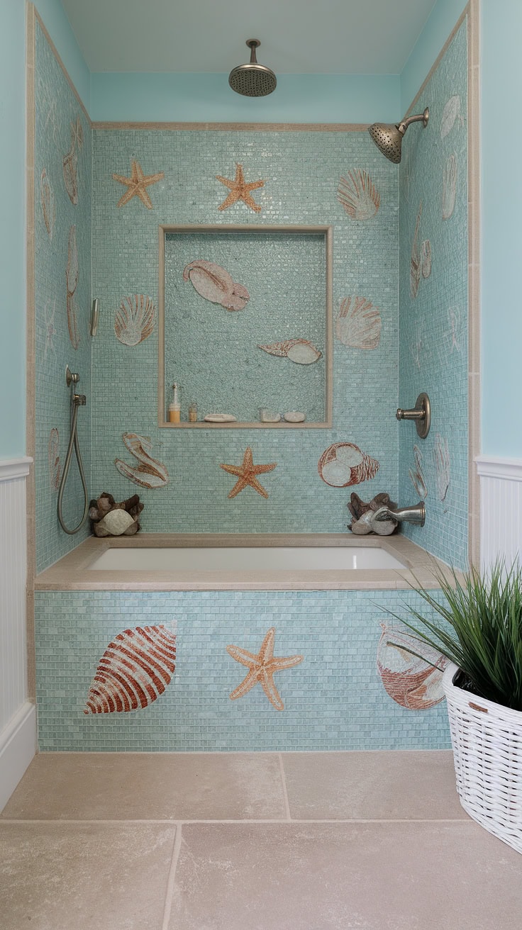 Escape every morning to this serene beach-inspired bathroom where soft blue walls and sheer curtains frame a shower lined with sea glass tiles in large-format layout. The bathtub surround adds a touch of playful charm with its mosaic design featuring starfish and seashell motifs, embodying an artful blend of fun and sophisticated coastal style. This bathroom stands as a prime example of mosaic bathroom ideas combined with trending, colorful shower tile trends.