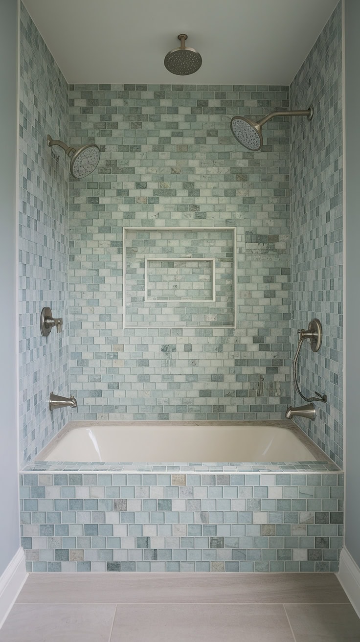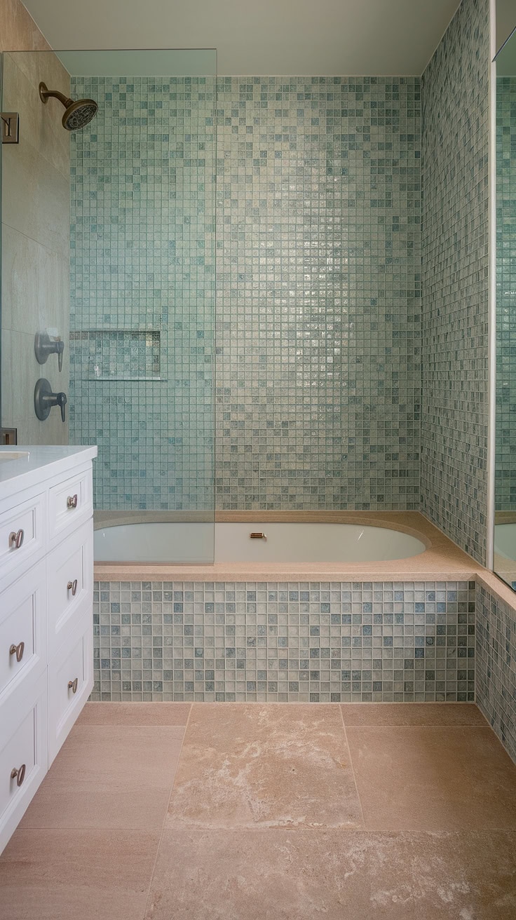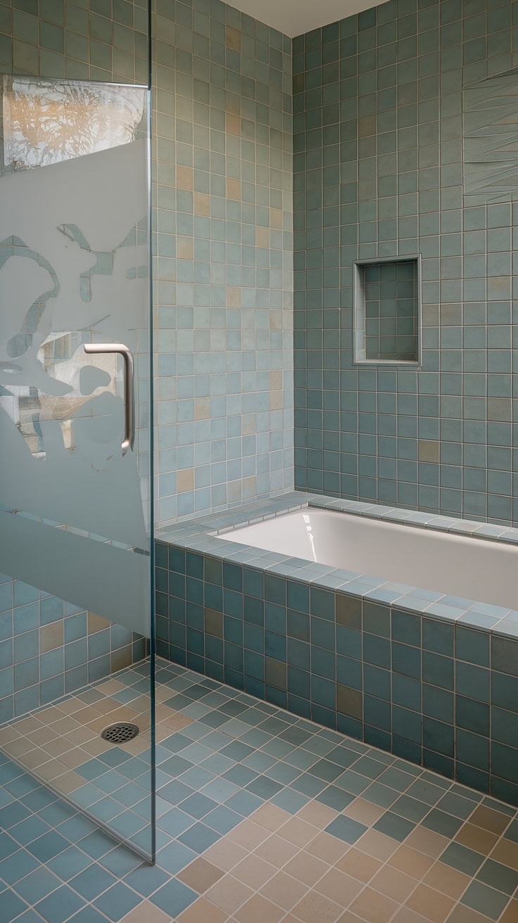 Reimagine your bathroom as a serene beach escape with this lavish design. Featuring expansive large-format tile flooring paired with a breathtaking bathtub surround utilizing gradated sea glass tiles, this mosaic bathroom concept dazzles in soothing tones of blues, greens, and warm beiges. Thoughtful additions like built-in niches and shelves offer convenience, while frosted glass doors and modern drainage systems finalize this trend-forward and functional space.