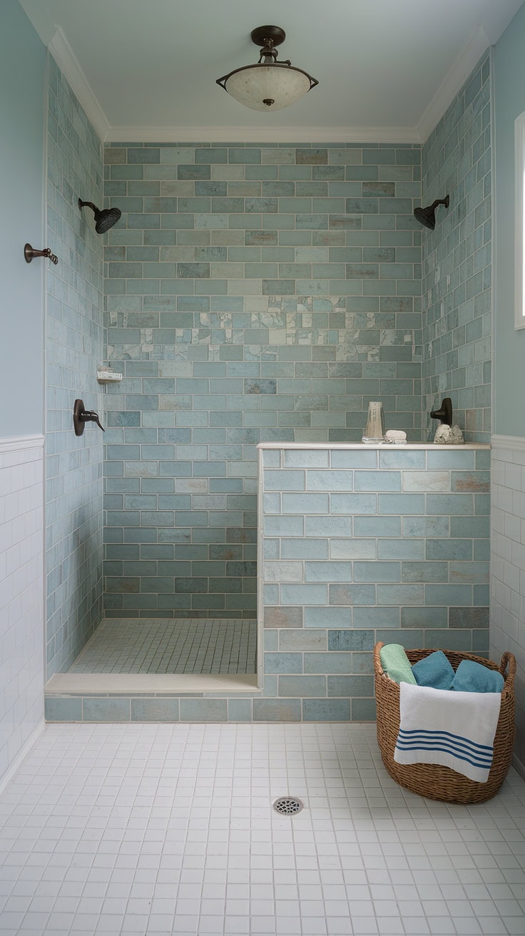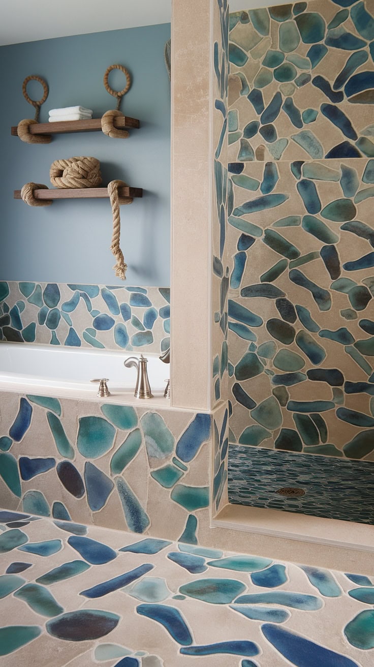 Imagine unwinding in a tranquil bathroom where a large-format sea glass tile bath surround and matching shower tiles create an atmosphere of exquisite serenity. Nautical details such as rope accents and wooden shelving add warmth, while the cohesive palette of colorful shower tiles and tub walls work harmoniously to capture the essence of oceanic beauty, showcasing expert use of beach bathroom tile.