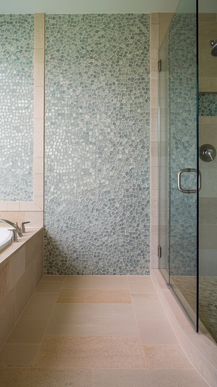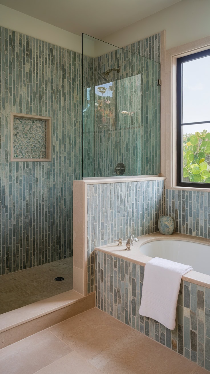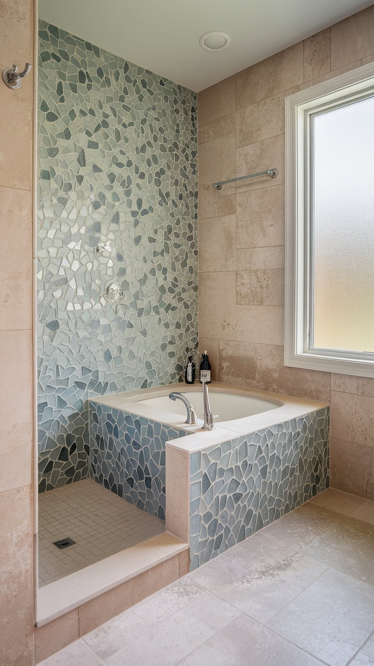 Retreat into peaceful surroundings with this elegant shower, where large-format tiles merge with artistic sea glass mosaic tub surrounds. Showcasing the latest tile trends, this design creatively fuses vivid tile colors with soothing beach-inspired palettes, presenting a perfect blend of aesthetics and tranquility.