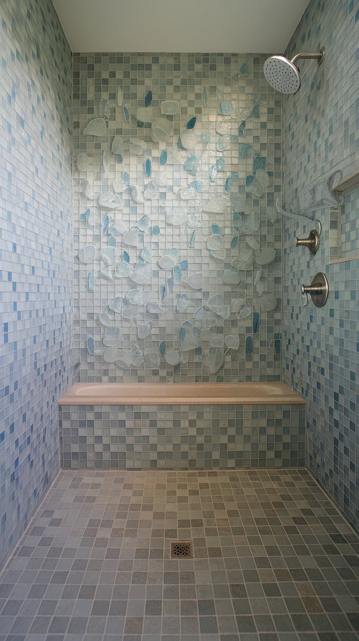 Illuminated by abundant natural light, this spa-inspired bathroom shower features an exquisite design. The expansive large-format tile flooring harmonizes beautifully with the intricate sea glass mosaic walls, evoking a peaceful coastal tile ambiance. A built-in bench enhances usability, while the rainfall showerhead elevates the luxurious atmosphere. Showcasing vibrant and trending tile concepts, this colorful shower tile arrangement inspires those longing for distinctive tub tile walls and exquisite bathtub surrounds. The sea glass tile effortlessly channels the soothing spirit of ocean waves.