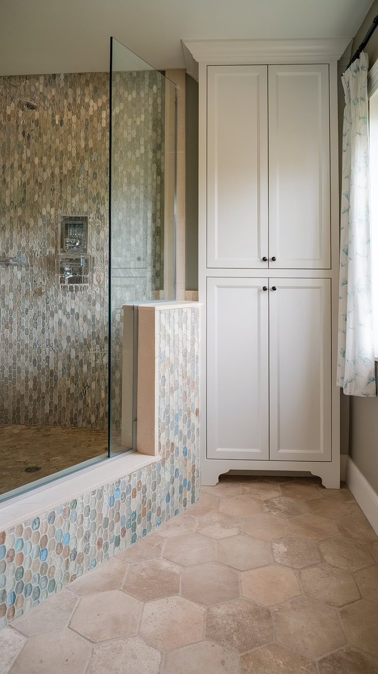 This bathroom makeover highlights popular tile designs, featuring a calming beige large-format tile floor. The centerpiece is a lavish shower with a sea glass tile mosaic floor, bursting with colors that capture the soothing ocean’s vibe. Paired with beachy blues and greens on the bathtub surround and textured tub walls, this design offers a flawless balance of comfort and coastal elegance, enhanced by frosted windows that allow light with privacy.