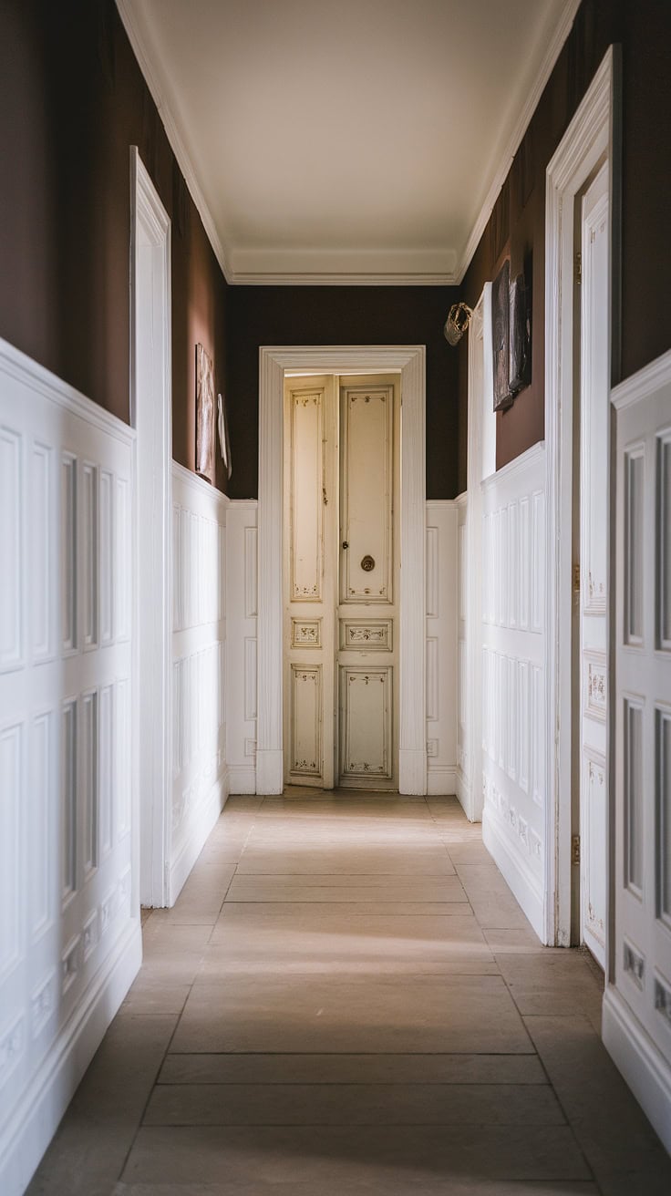Combining dark woodwork with pristine white paneling, this corridor showcases how thoughtful wainscoting can bring warmth and depth to long hallways. Its well-planned molding offers fresh [hallway millwork ideas](https://www.amazon.com/s?k=hallway+millwork+ideas&tag=bonofashion-20), inspiring homeowners to add architectural elegance to their foyers and upstairs spaces.