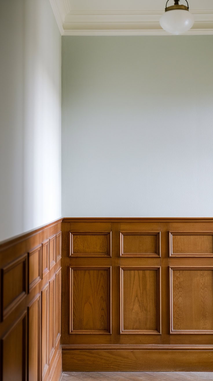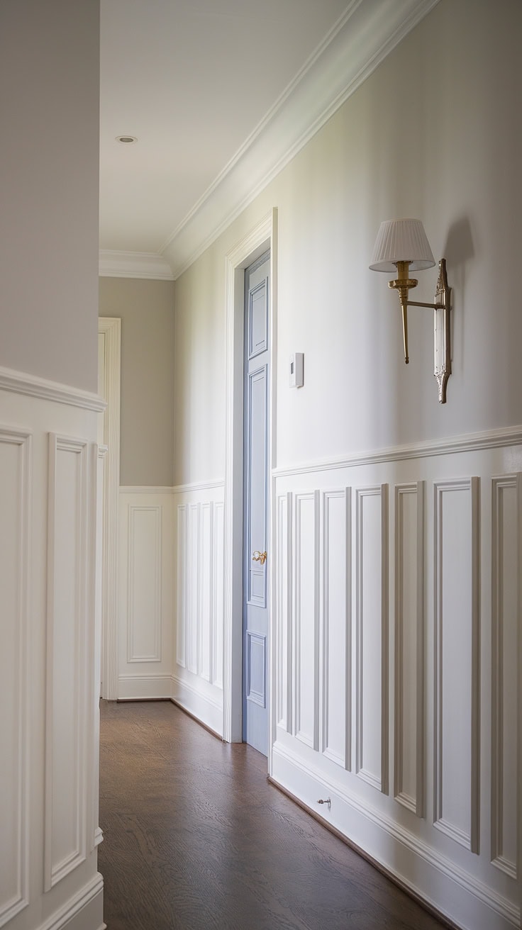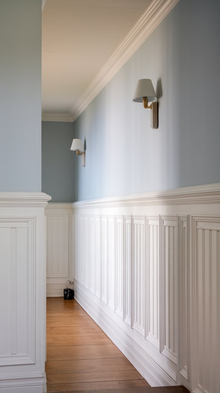 Light blue upper walls paired with white wainscoting create serene contrast in this hallway. Stylish lantern lighting and dark wood floors enrich the setting, serving as a perfect example of how elegant molding and paneling can transform a conventional hallway into a warm, inviting space. These ideas provide excellent inspiration for those seeking to personalize blank walls or enhance upstairs corridors.