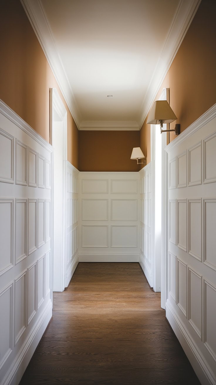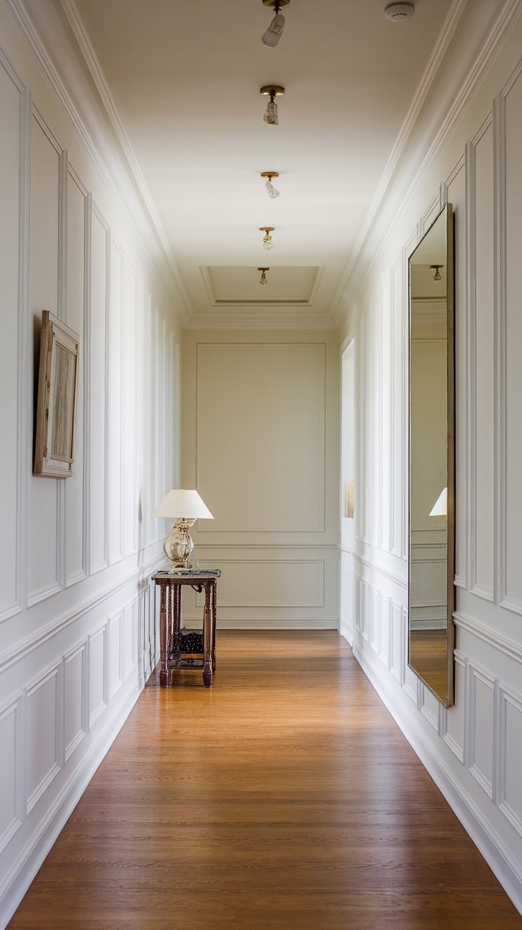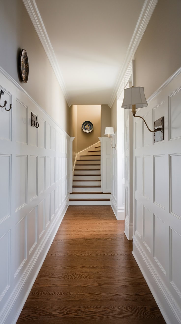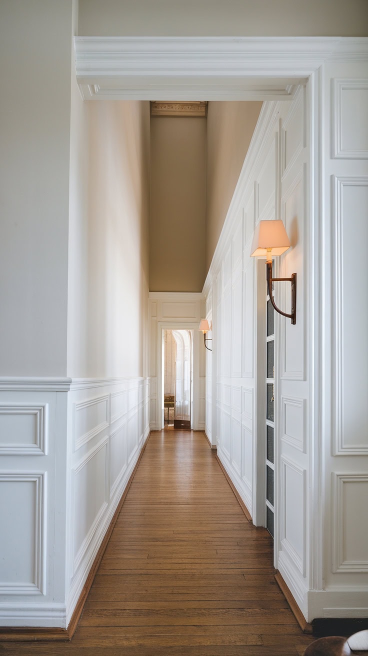Bright white wainscoting injects fresh vitality into this corridor, perfectly balanced by rich hardwood flooring and warm lighting. Curious about molding enhancements? Discover effective [small hallway molding ideas](https://www.amazon.com/s?k=small+hallway+molding+ideas&tag=bonofashion-20) to add subtle sophistication to any space, no matter its size.