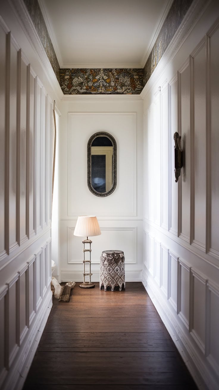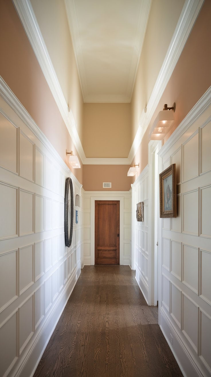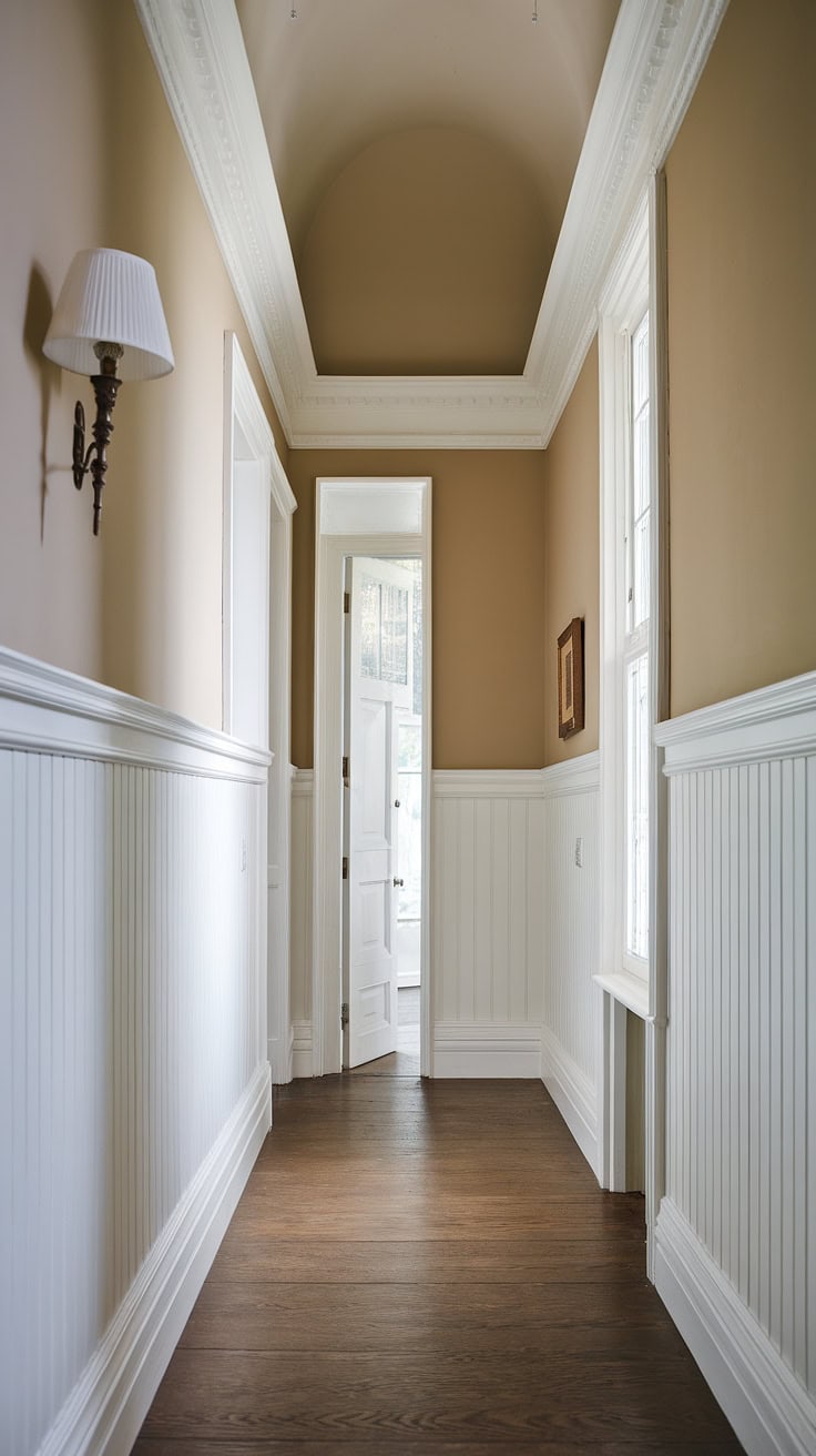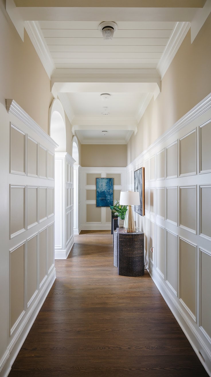 Bright white wainscoting injects fresh vitality into this corridor, perfectly balanced by rich hardwood flooring and warm lighting. Curious about molding enhancements? Discover effective [small hallway molding ideas](https://www.amazon.com/s?k=small+hallway+molding+ideas&tag=bonofashion-20) to add subtle sophistication to any space, no matter its size.