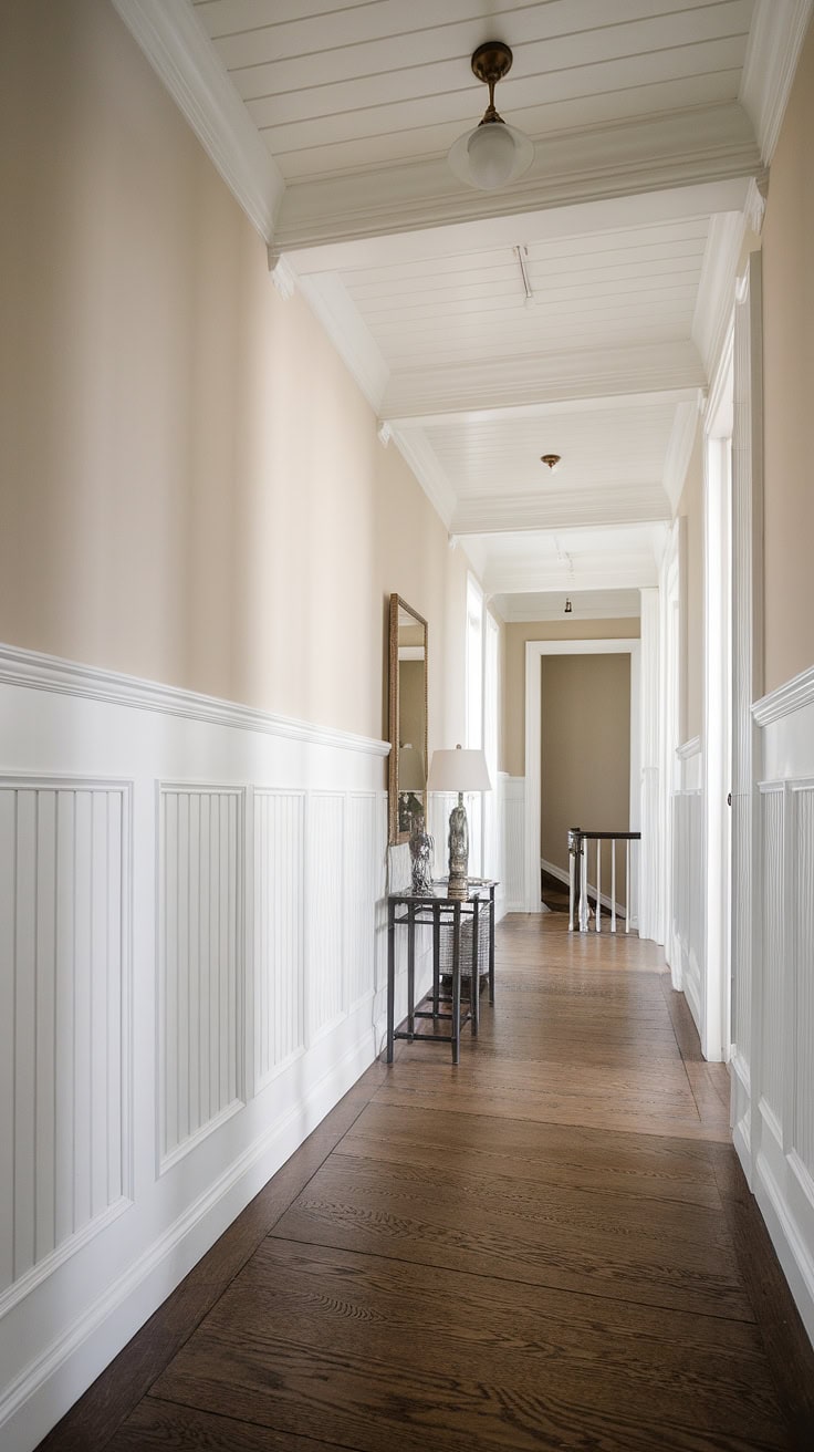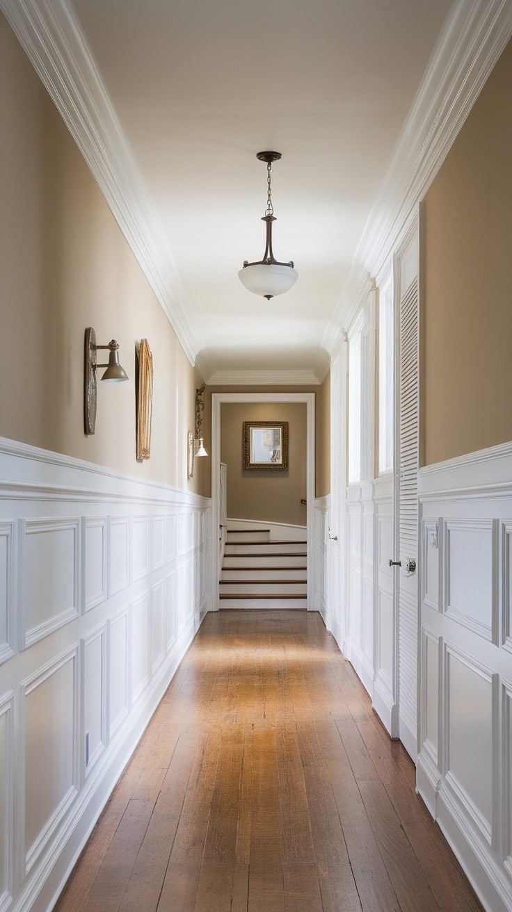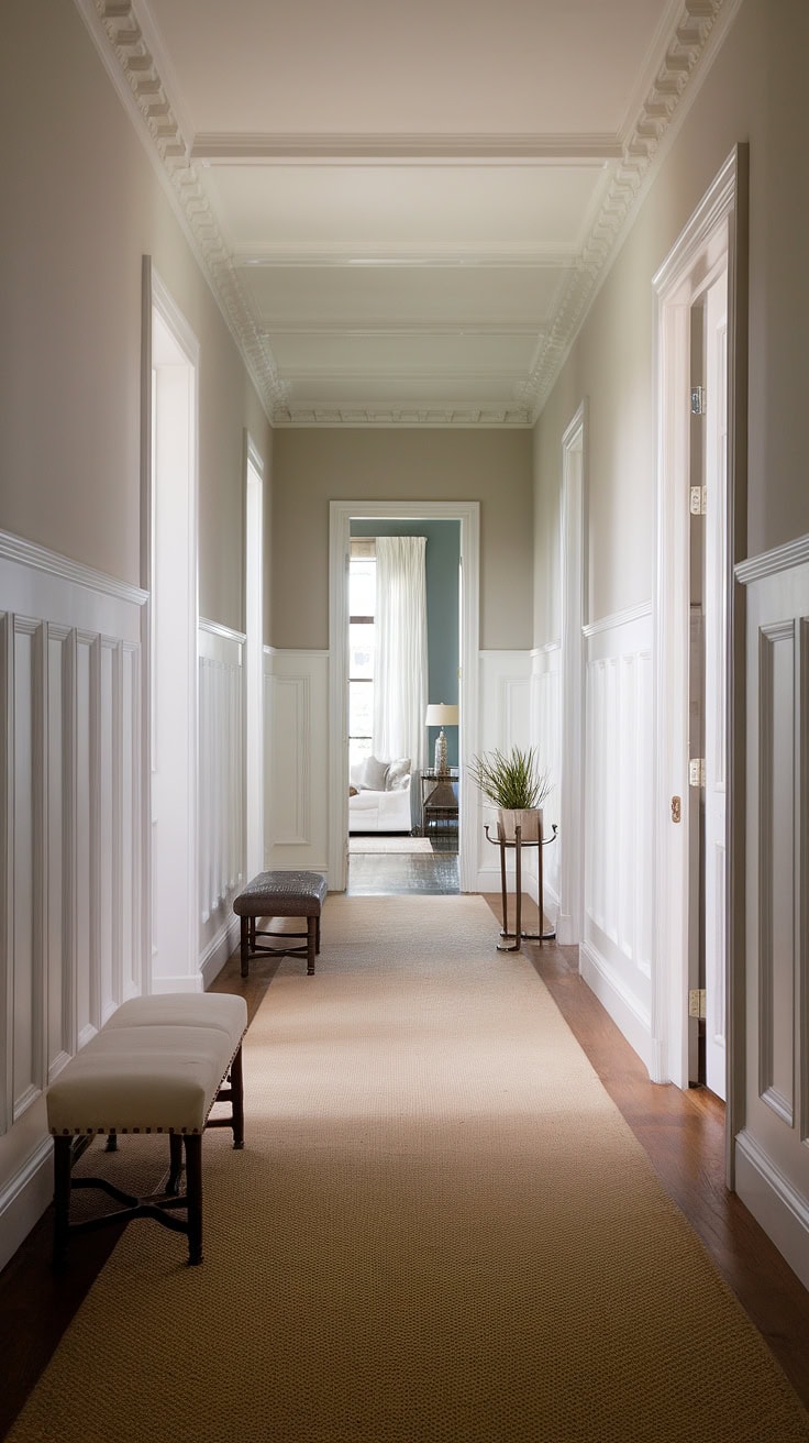 Simplicity shines in this hallway where wainscoting rises halfway up the wall, leaving upper space ideal for functional additions like hooks or art installations. This design merges charming molding details with practical considerations, creating inspiring hallway ideas suited for long, narrow spaces.