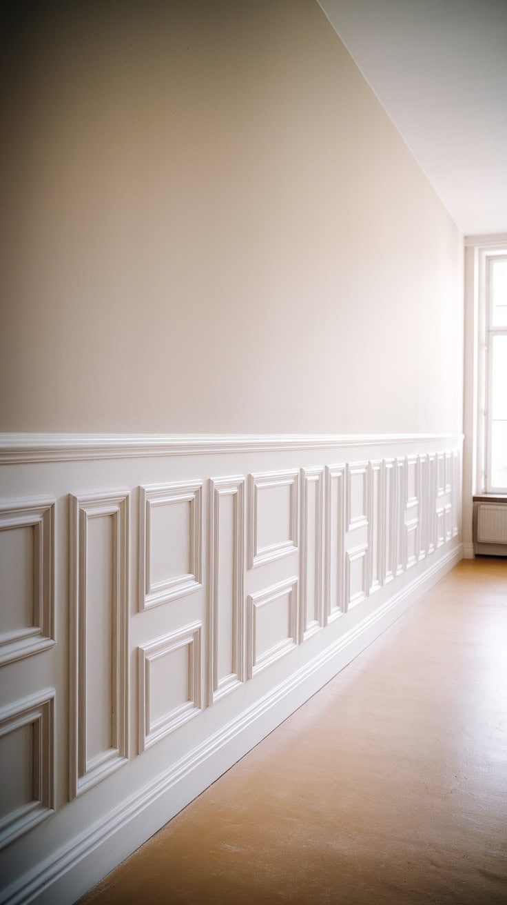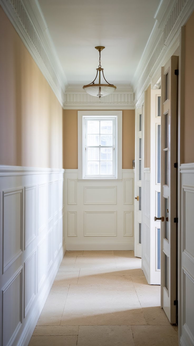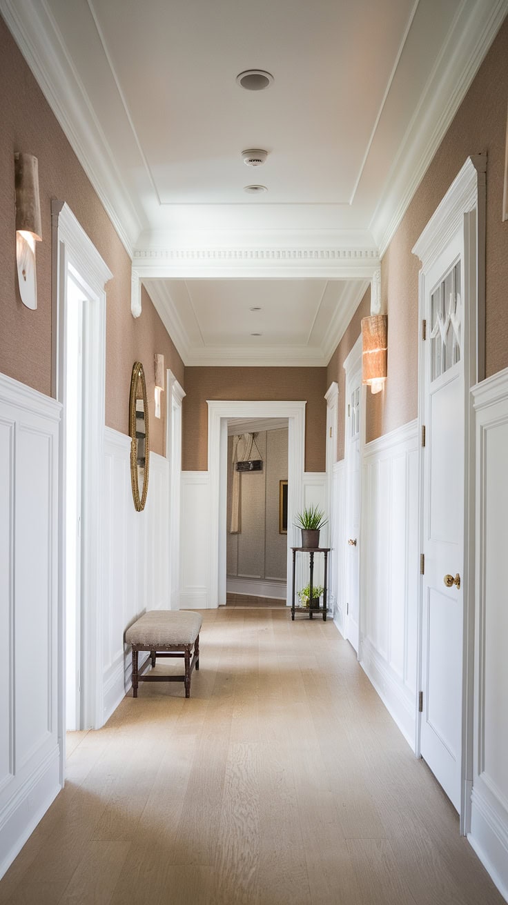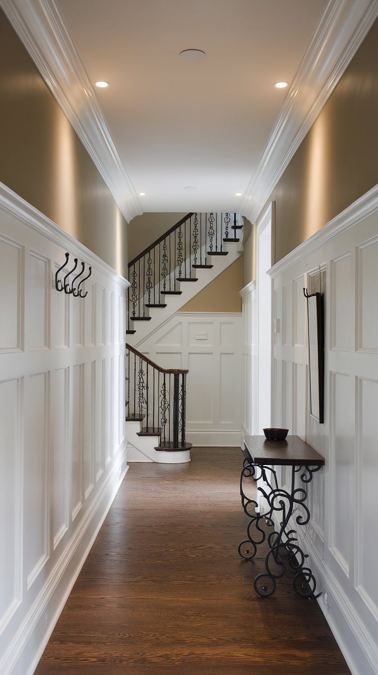 Simplicity shines in this hallway where wainscoting rises halfway up the wall, leaving upper space ideal for functional additions like hooks or art installations. This design merges charming molding details with practical considerations, creating inspiring hallway ideas suited for long, narrow spaces.