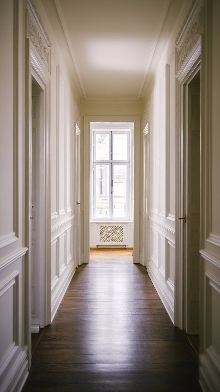 A sophisticated halo of white paneling gracefully enhances this entryway foyer, creating a refined atmosphere. The juxtaposition of dark hardwood floors with the white wainscoting crafts depth and warmth, perfect for inspiring long hallway decor. Notice how modest molding features subtly transform an unadorned wall into a captivating design element. The luminous window at the far end injects natural light, elevating this hallway’s elegant character.