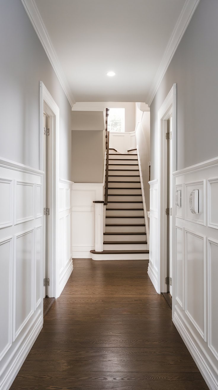 This hallway stands as an exquisite example of foyer wainscoting elevating a lengthy passage. White paneling flows seamlessly toward a majestic staircase, integrating detailed molding to optimize space and add character. Such design strategies serve as exemplary lessons for those aiming to fuse grandeur with practical hallway solutions.