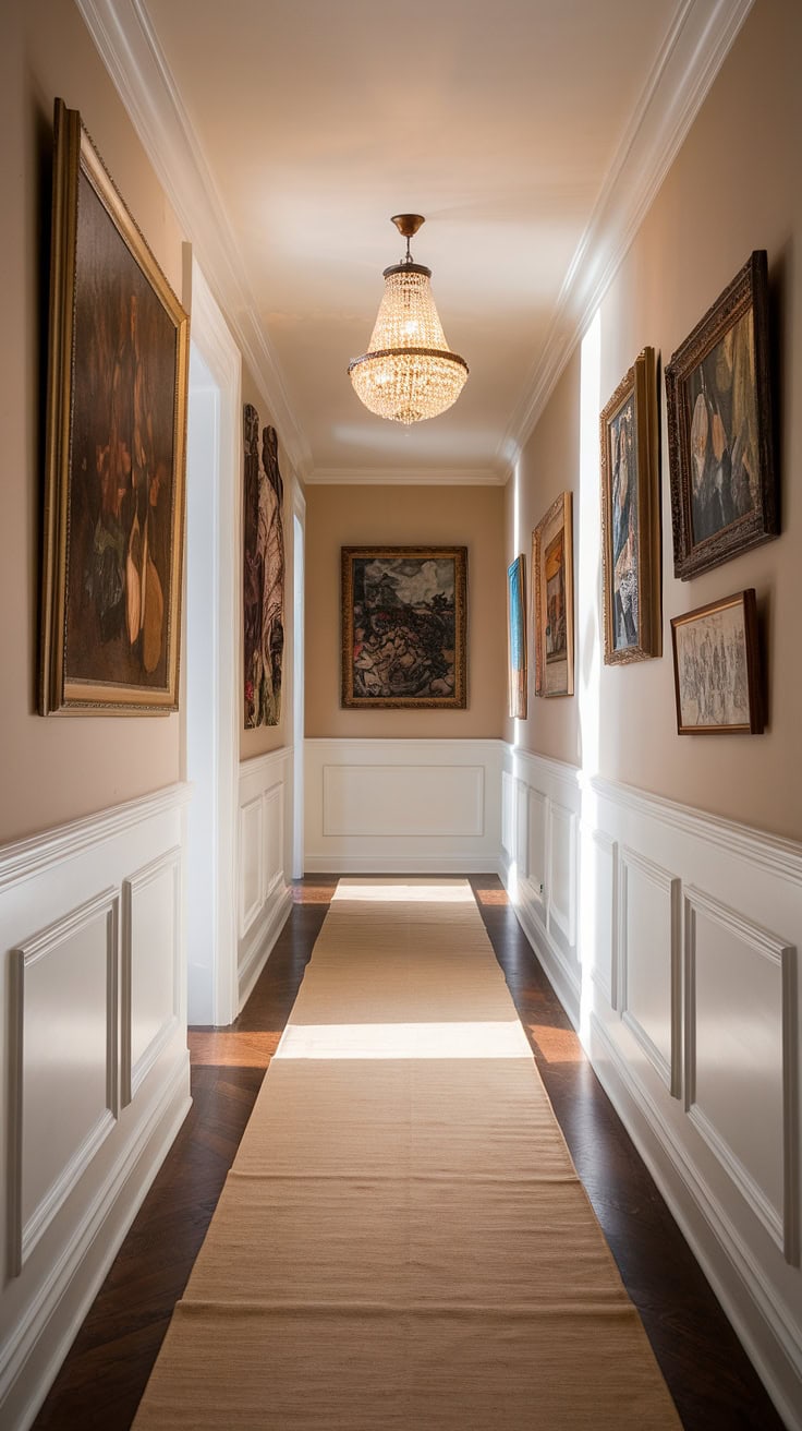 Transform your upper corridor into an artful foyer with this elegant white paneling technique. A beige-silk runner softens the floor while eclectic artwork and a grand chandelier infuse personality and warmth. This design exemplifies refined [millwork ideas](https://www.amazon.com/s?k=hallway+millwork+ideas&tag=bonofashion-20) and molding strategies perfect for enhancing blank walls and creating inviting, gallery-like spaces.