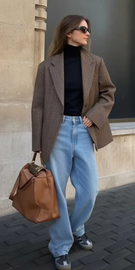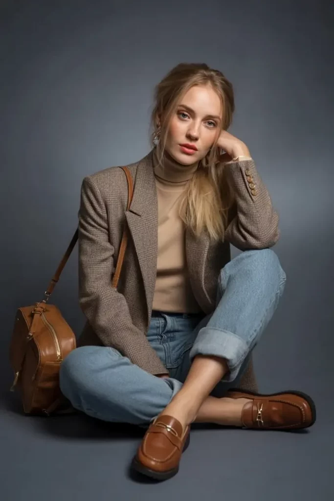 A taupe turtleneck paired with a warm brown blazer and soft blue jeans represents minimalist elegance at its finest. This look is softened further by cognac-toned loafers and matching bags, exemplifying understated power dressing.