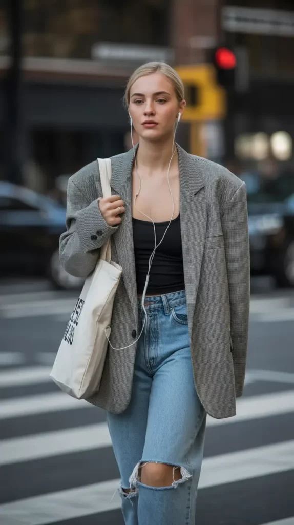 This blend of relaxed tailoring and comfortable denim is perfect for busy city outings—showing how casual can be intentional and contemporary. With earbuds in and coffee in hand, it’s the epitome of quiet confidence.