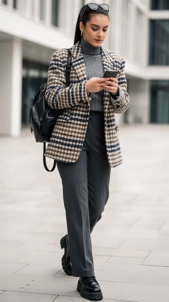 A checked blazer layered on a gray turtleneck, matched with grey straight trousers and chunky black shoes, invites the perfect combination of scholarly and chic. Minimalistic gold hoops and slicked-back hair amplify the effortless power of this silhouette, ideal for various settings—from boardrooms to brunch spots.