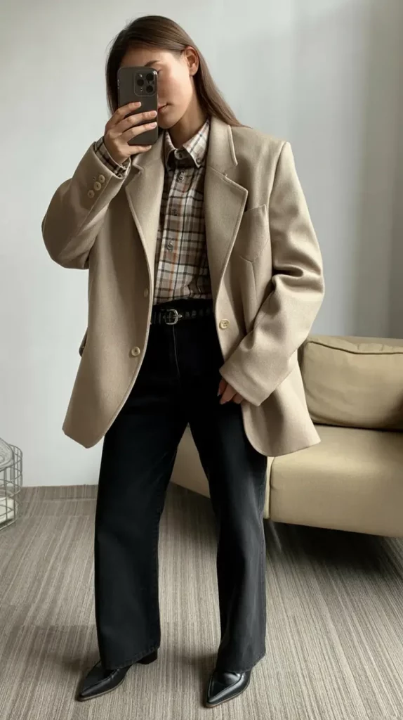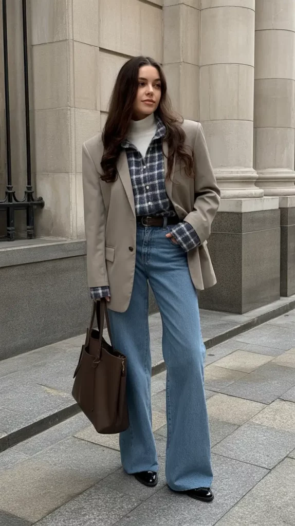 An oversized beige blazer paired with layered plaid shirts alongside crisp denim effortlessly blends comfort and refinement. This look thrives on the contrast of textures—crisp denim, soft flannel, and structured wool—making it an ideal choice from late autumn through early spring.