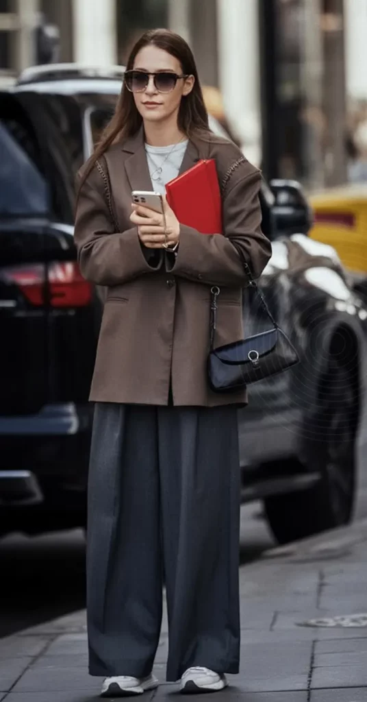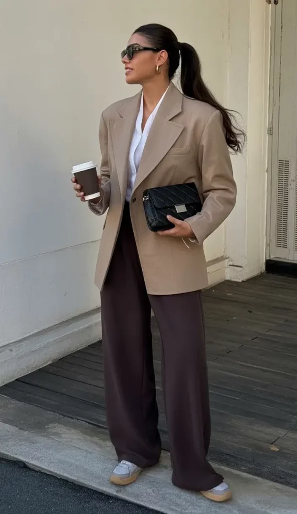 A camel blazer combined with wide brown trousers and a crisp white blouse signals effortless sophistication. Adding sneakers and a sleek black clutch introduces a striking balance between high-end and practical.