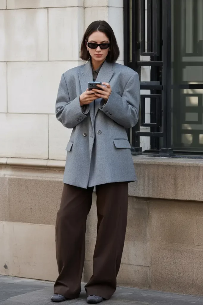 A tailored gray blazer paired with voluminous brown trousers creates a striking yet relaxed silhouette. The masculine-inspired cut balanced by fluid movement makes this a standout business-casual ensemble, complemented by vintage oversized sunglasses.