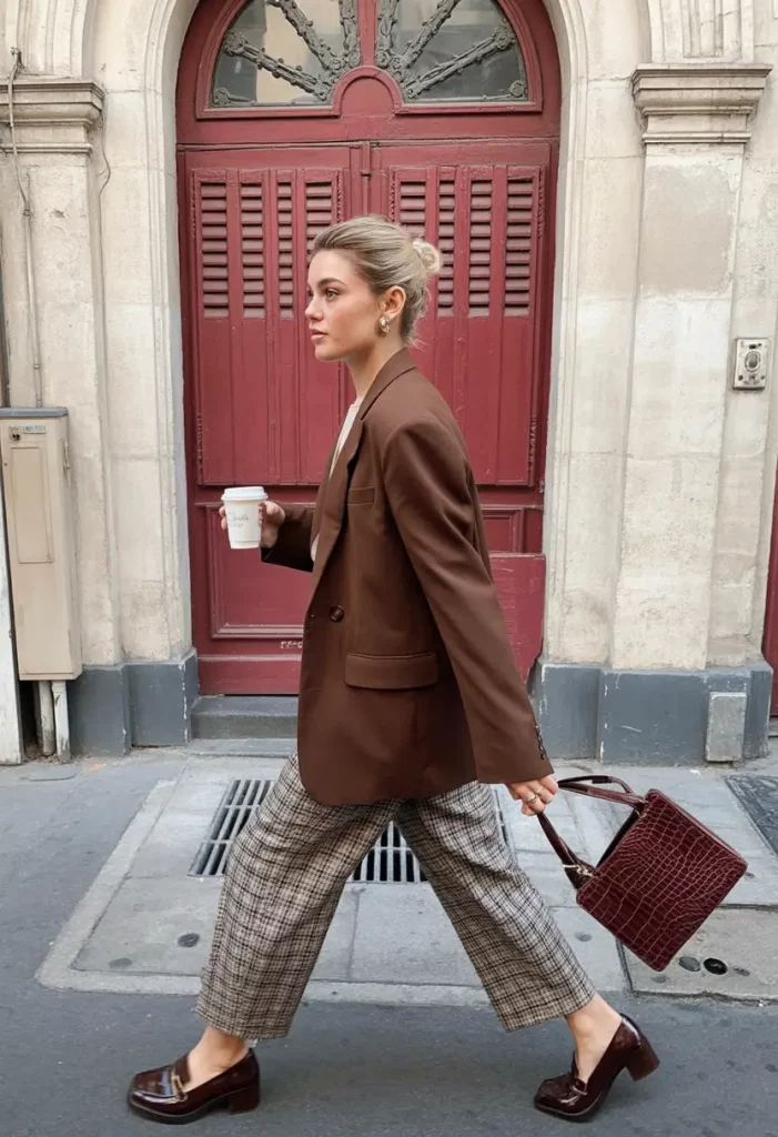 A rich chocolate blazer paired with cropped plaid trousers and a structured burgundy handbag embodies the casual sophistication of a leisurely walk through a European city district. Patent loafers add polish, completing a refined yet relaxed ensemble.