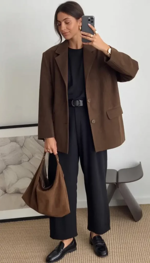 A deep brown blazer with flowing black trousers and loafers create a silhouette that is both timeless and casual. The matte and glossy fabric contrasts add luxury without excess, making this a versatile outfit suitable for all seasons.