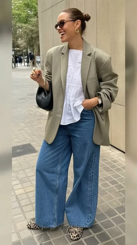 Bright yet soft, an olive-beige blazer paired with wide-leg denim and white blouse exudes carefree confidence. Leopard-print shoes inject unexpected personality, setting the look apart.