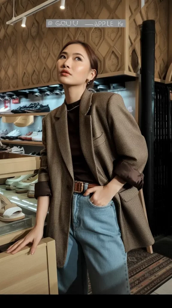 A checkered brown blazer pairing beautifully with dark chocolate top and flowing denim captures both comfort and refinement. Rolled cuffs and gleaming gold accessories elevate the cozy, lived-in aesthetic.