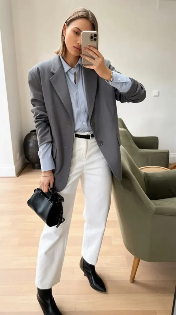 This look captures the essence of a perfect blazer outfit: polished yet comfortable, professional but never rigid. It’s the ideal choice when blending style with ease is necessary.