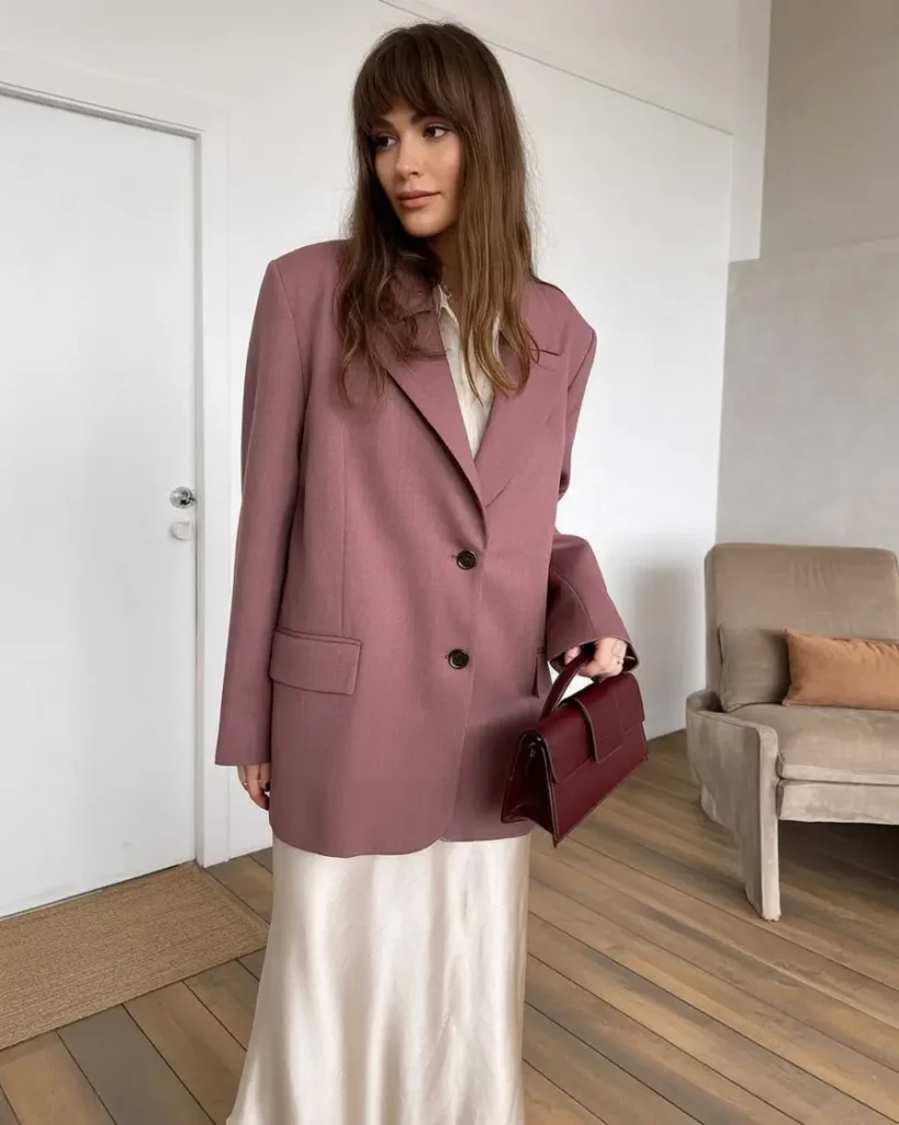 A dusty rose blazer over a cream satin dress offers an elegant whisper of romance. The contrast between matte and lustrous textures creates a visual poem perfect for spring evenings or early fall outings.