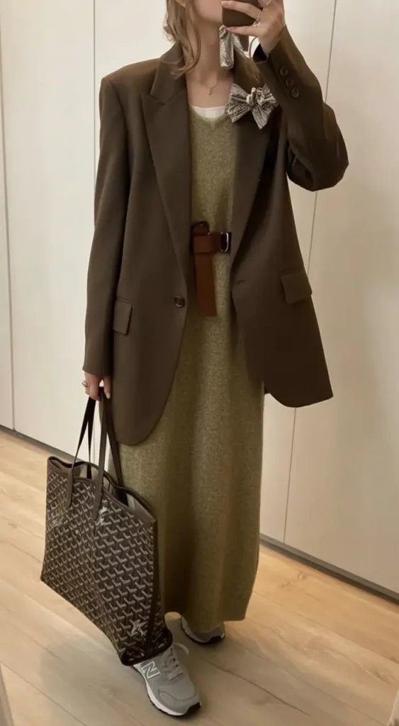 An olive wool dress belted with leather topped by a rich brown blazer strikes a balance of comfort and refinement. Coupled with a large tote and sneakers, this ensemble is both practical and polished.