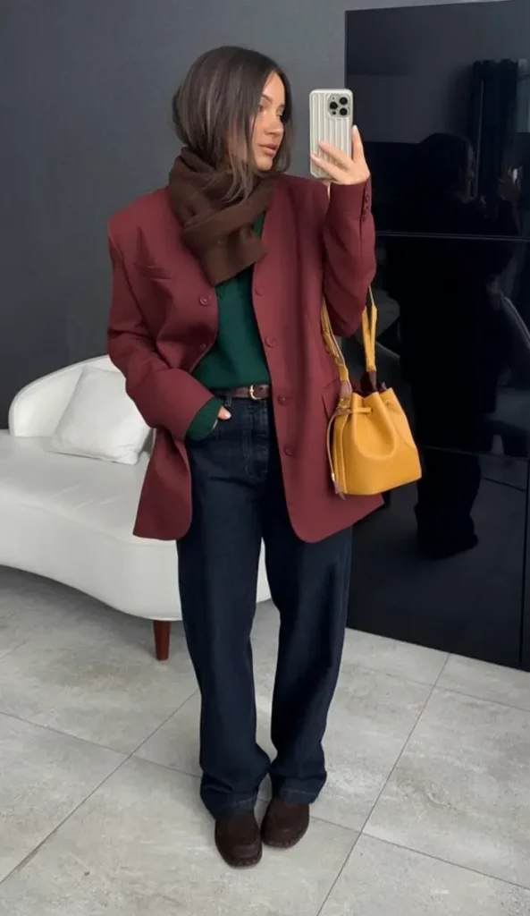 A burgundy blazer paired with a forest green sweater and deep indigo jeans creates a beautiful layered palette rich in tone and sophistication. The mustard-yellow bag adds warmth and a playful accent to this elegant yet bold ensemble.