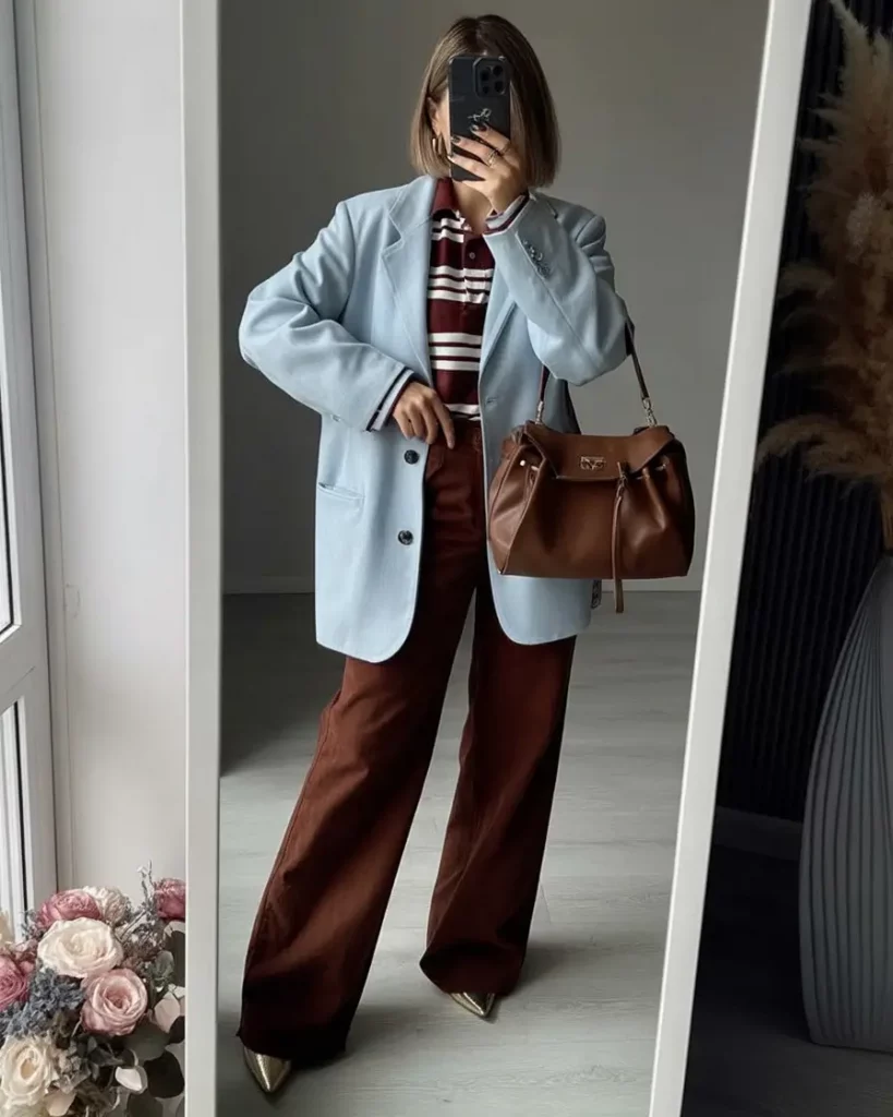 A sky-blue blazer paired with chocolate trousers and a striped polo injects nostalgic energy into everyday dressing. Pointed shoes add an elegant vintage touch, balancing warmth and coolness perfectly.