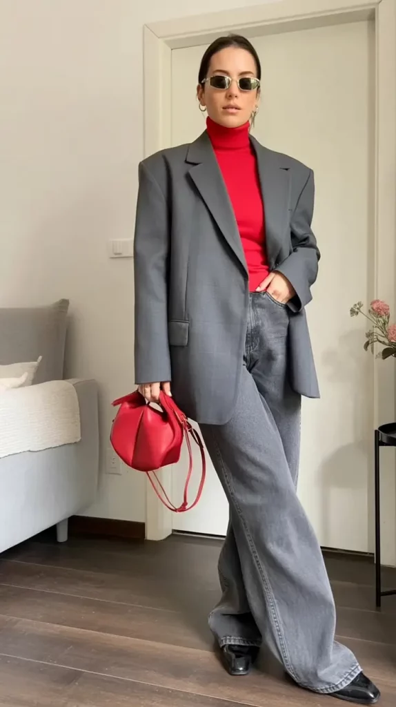 A gray blazer paired with a vivid red turtleneck and matching bag whispers boldness with calm assurance. The black foundational pieces let the red shine in a subtle yet unforgettable way.