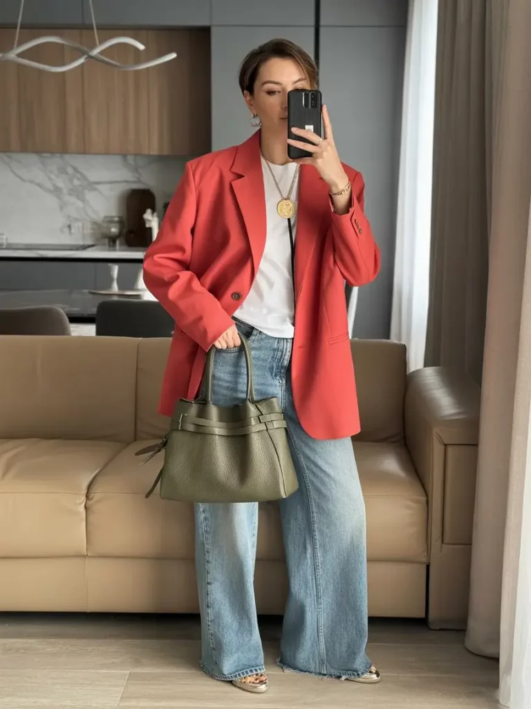 A vibrant coral blazer paired with a simple white tee and loose jeans captures laid-back minimalism at its best. An olive handbag adds unexpected contrast, showcasing that matching accessories isn’t always necessary for coherence.