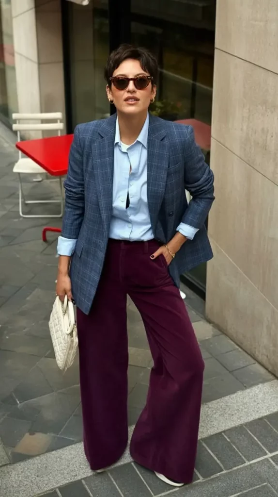 Closing this style journey, a blue check blazer over a pale shirt paired with deep plum trousers offers an arresting, yet balanced silhouette. Navy, lilac, and burgundy knit beautifully, softened by gold details and a light woven handbag for all-day versatility.