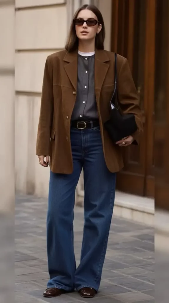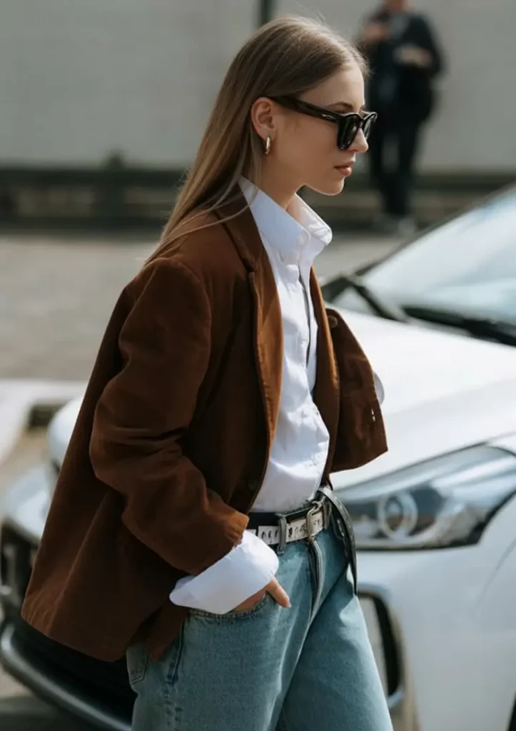 Timeless combinations like a crisp white shirt, heritage denim, and a warm brown blazer never disappoint. This style exudes neatness, approachability, and sophistication—ideal for transitional seasons.