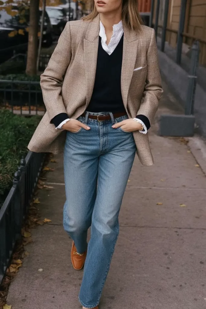 Nothing captures the essence of autumn quite like a softly checkered blazer layered over a white shirt and navy V-neck sweater. Paired with jeans, brown loafers, and a matching belt, it’s a harmonious mix of preppy charm and city wear.