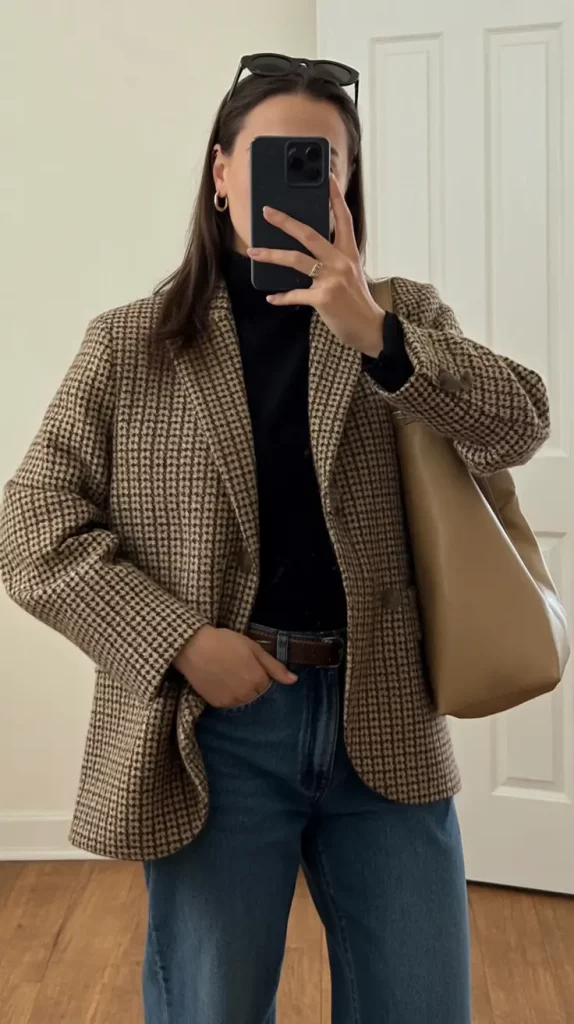 A classic small houndstooth blazer, sleek black turtleneck, and clean blue jeans create an intelligent, polished ensemble. Accessories like a spacious tote and subtle jewelry add finishing touches that elevate yet soften the look.