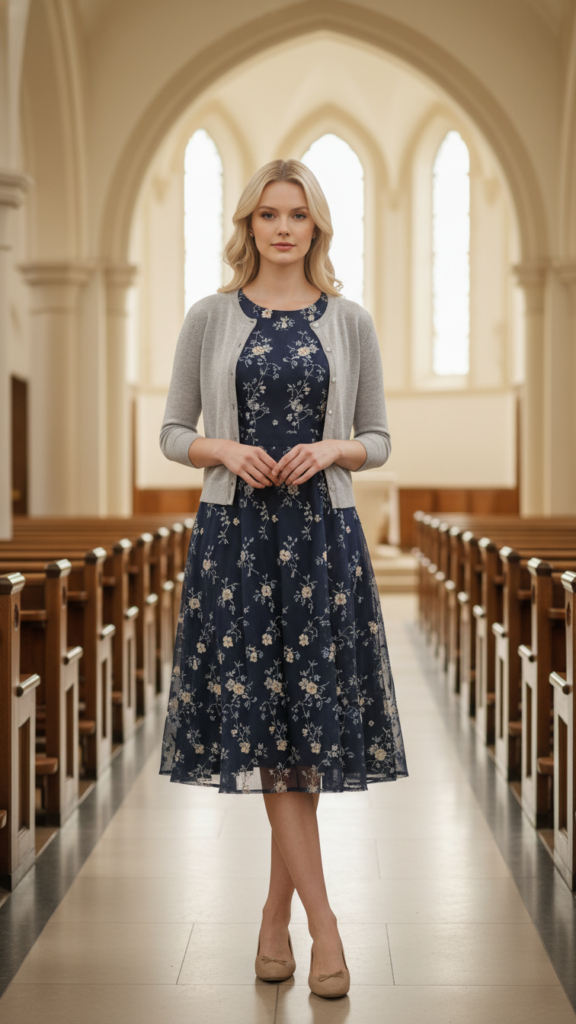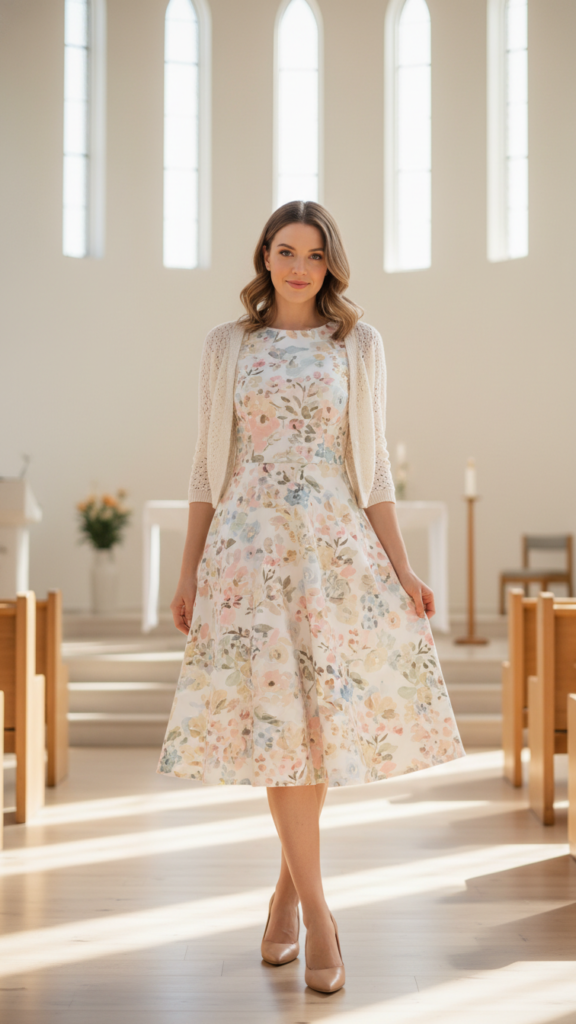 Complement your attire with low-heeled shoes and a light cardigan for additional coverage. Opt for muted floral shades over bold prints to maintain a serene worship environment, embodying a light and airy aesthetic that honors tradition.