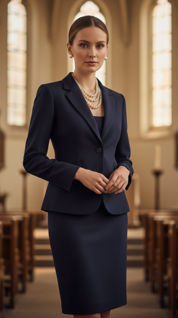 Stick to neutral palettes — deep navy, jet black, or creamy ivory — that harmonize with your complexion and reflect proper solemnity. A knee-length pencil skirt offers modest but flattering proportions, and the structured blazer adds sophistication without appearing overly formal.